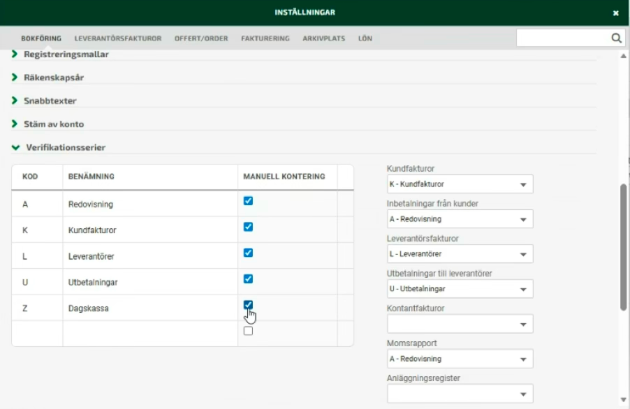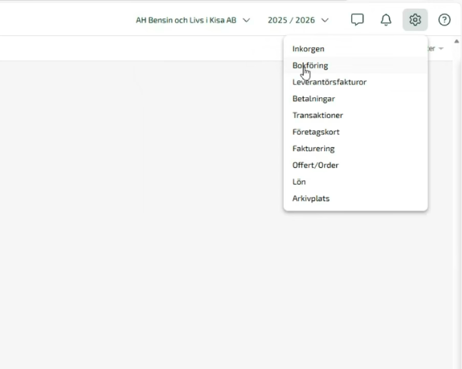 Set the verification series you wish to use for the integration to Manual. Go under the gear wheel and select “Accounting”.