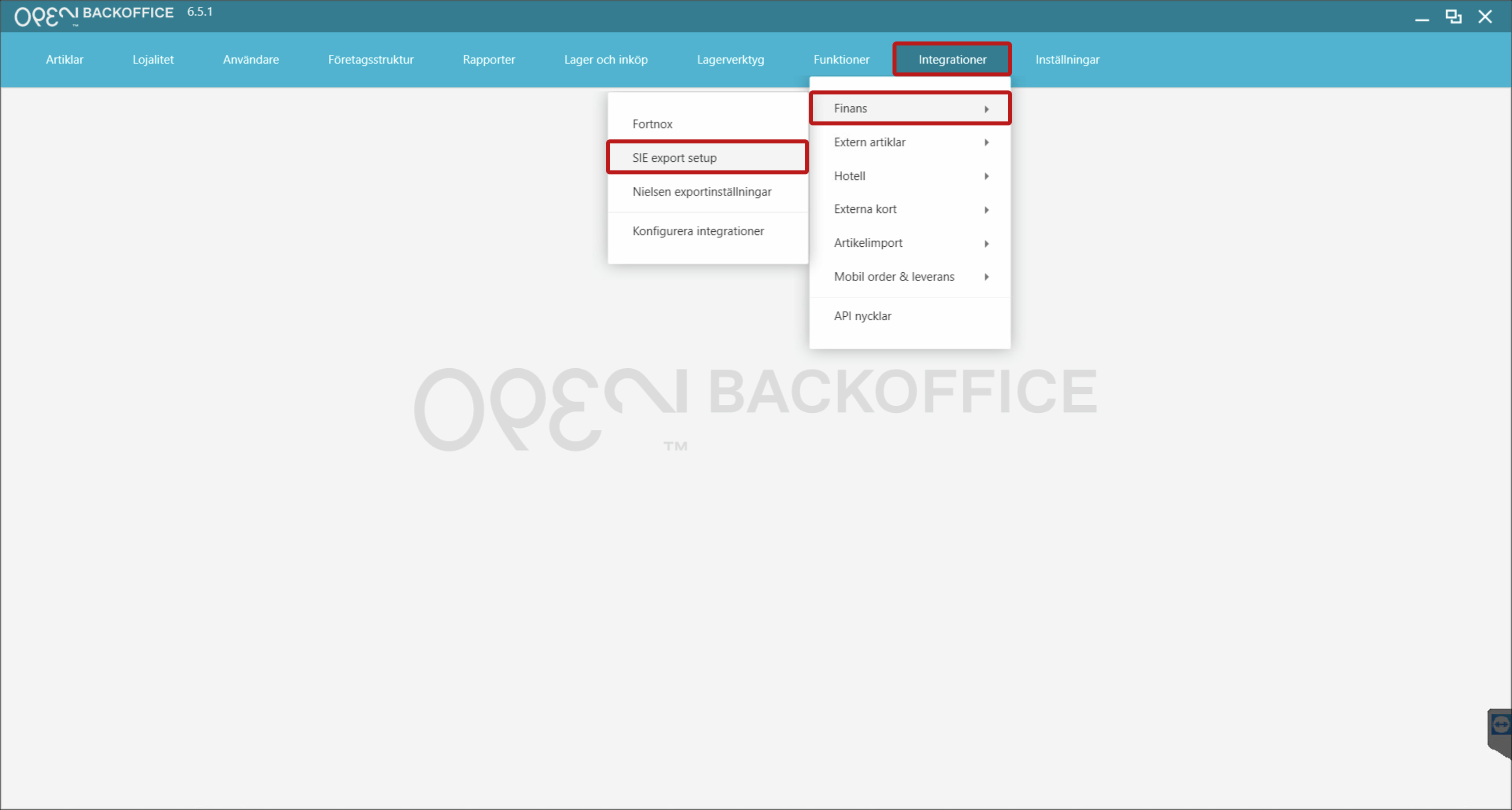 - Open Integrations in the top menu and go to Finance > SIE export setup.