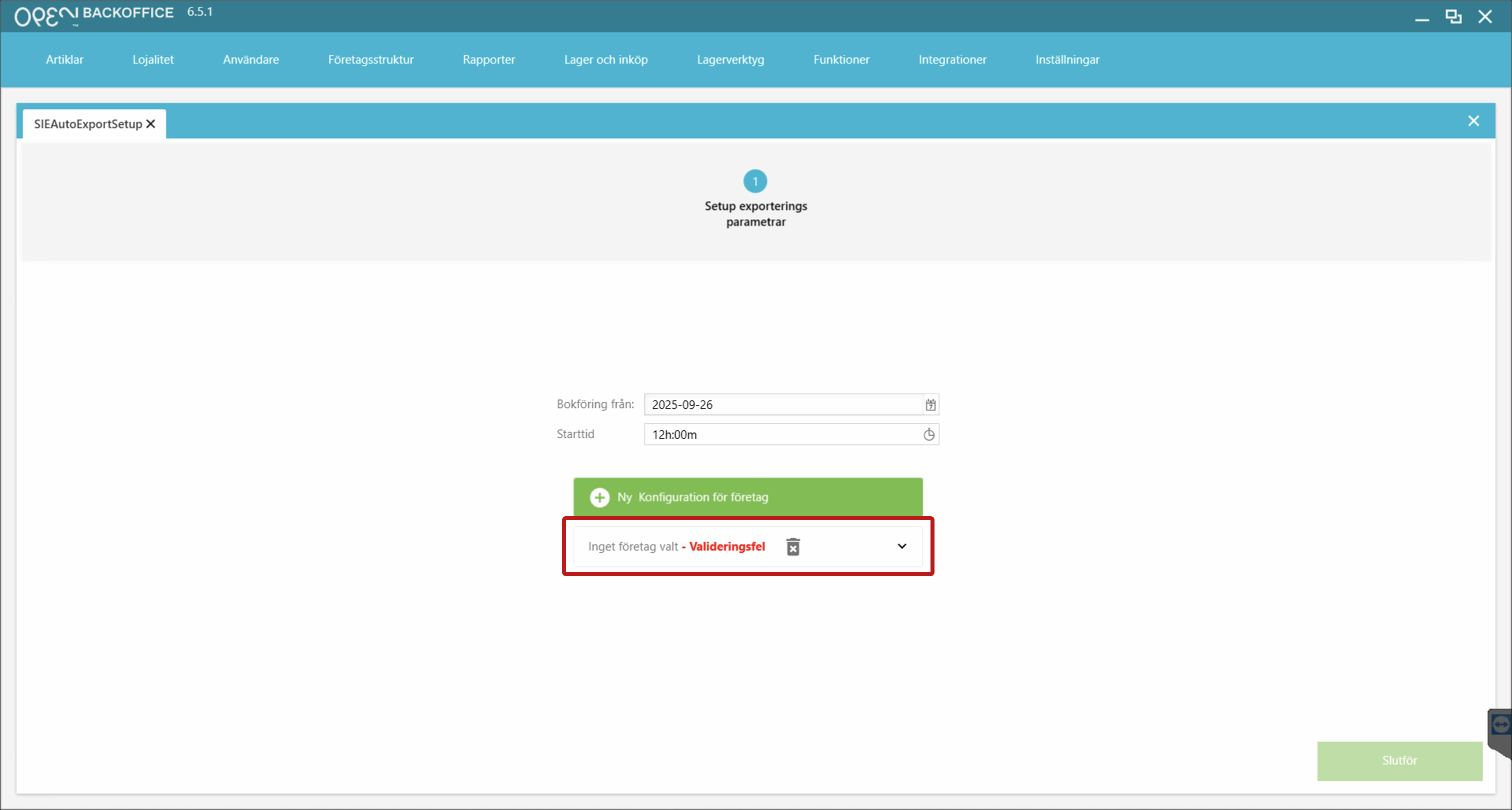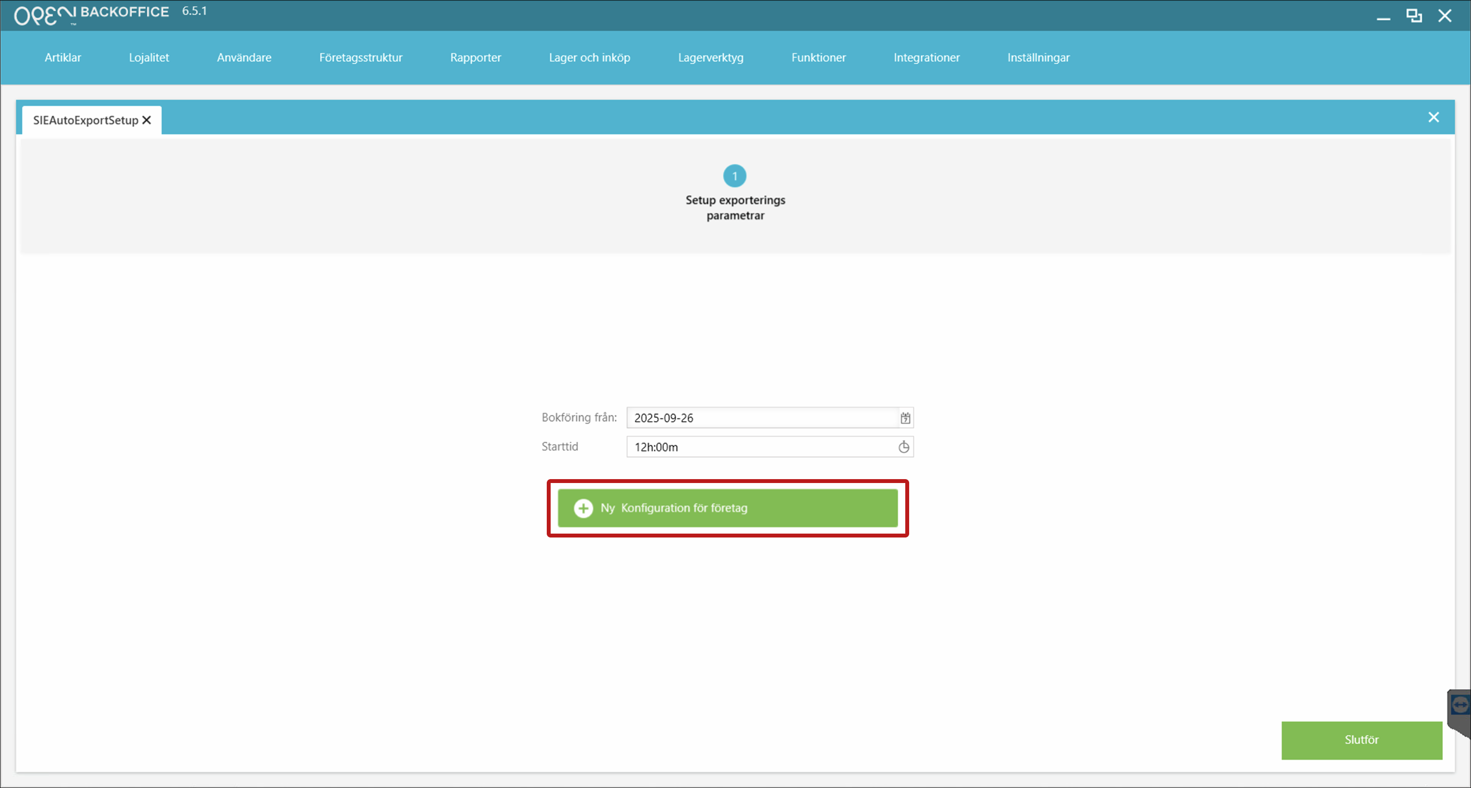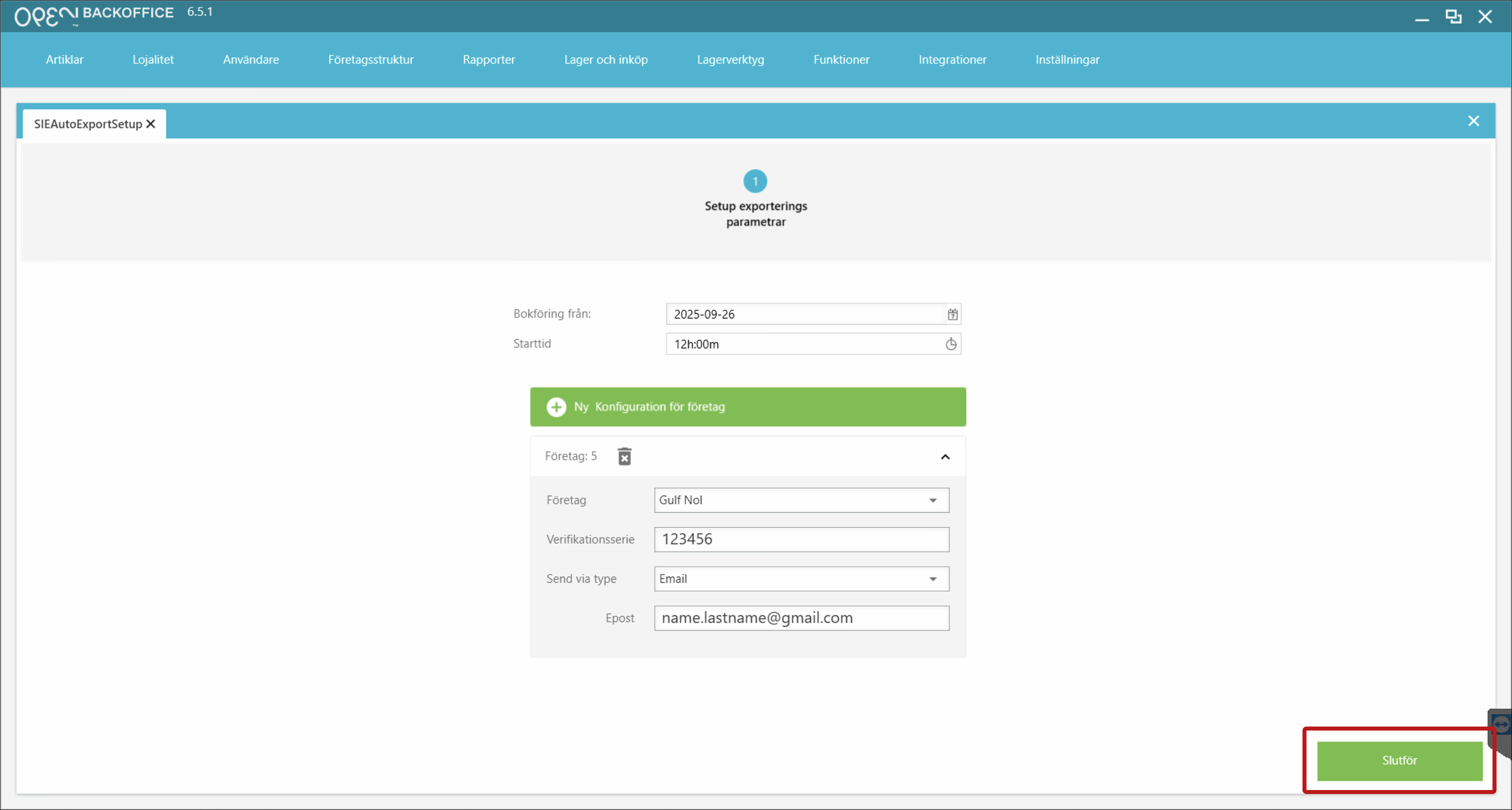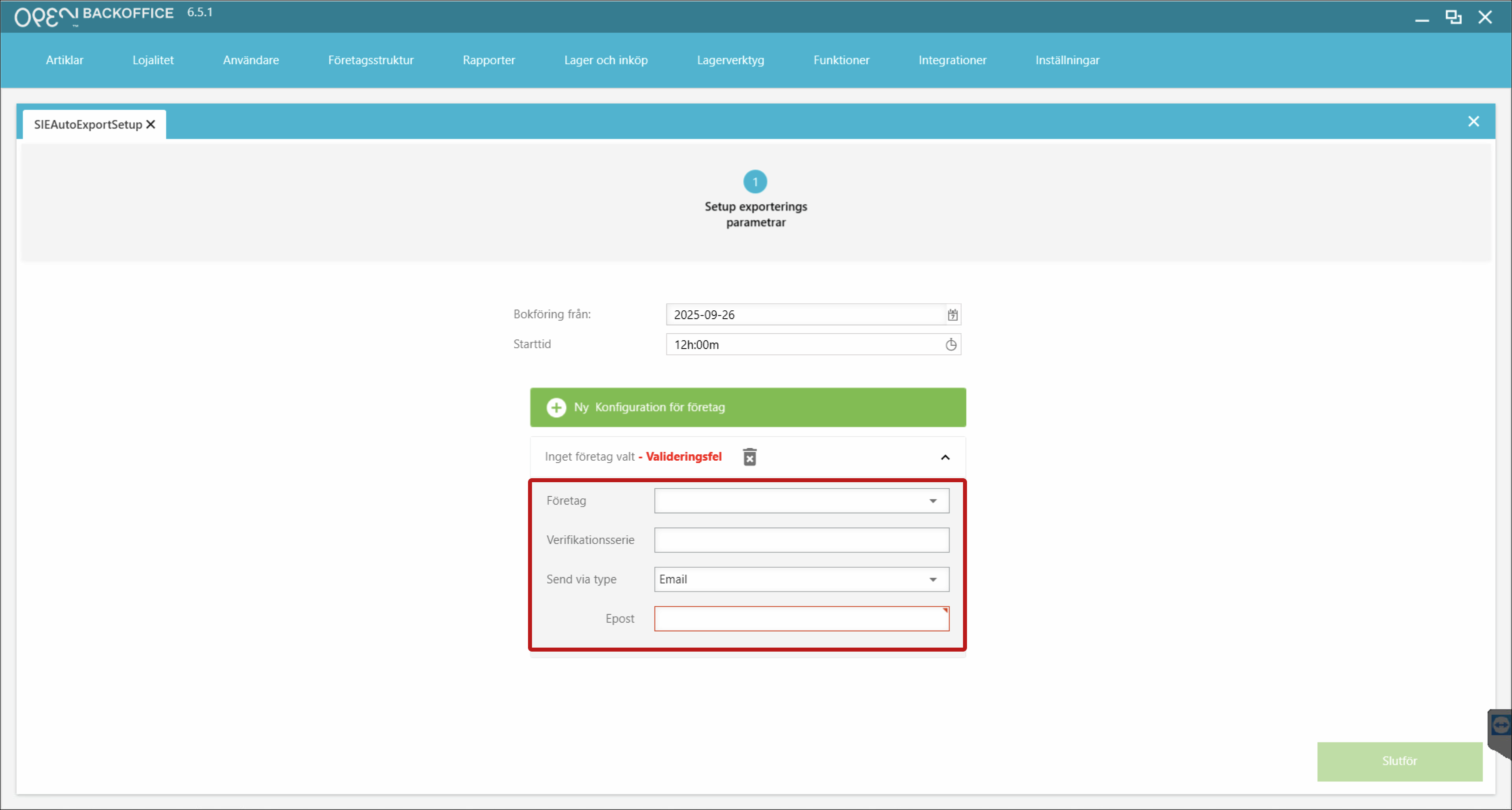 With the automatic export of SIE files, you can specify an email address that will receive a daily SIE file with sales data (after each day's closing).
