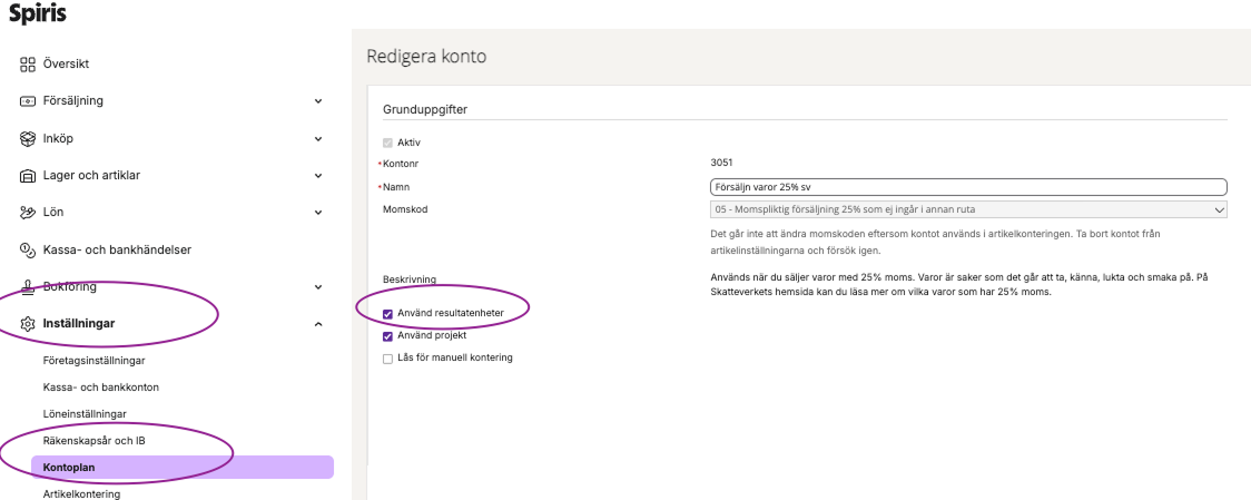 Activate Profit Units on the account you want: according to the image below: Make sure that all accounts are created and active in Spiris. This also applies to any accounts you have set during Account Mapping (Step 1).