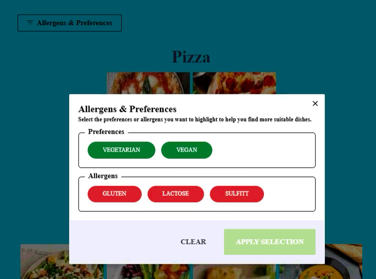 Articles in the menu can be tagged with “Allergens and preferences” from OPEN Backoffice. The tags can be used for filtering the menu in OPEN Express.