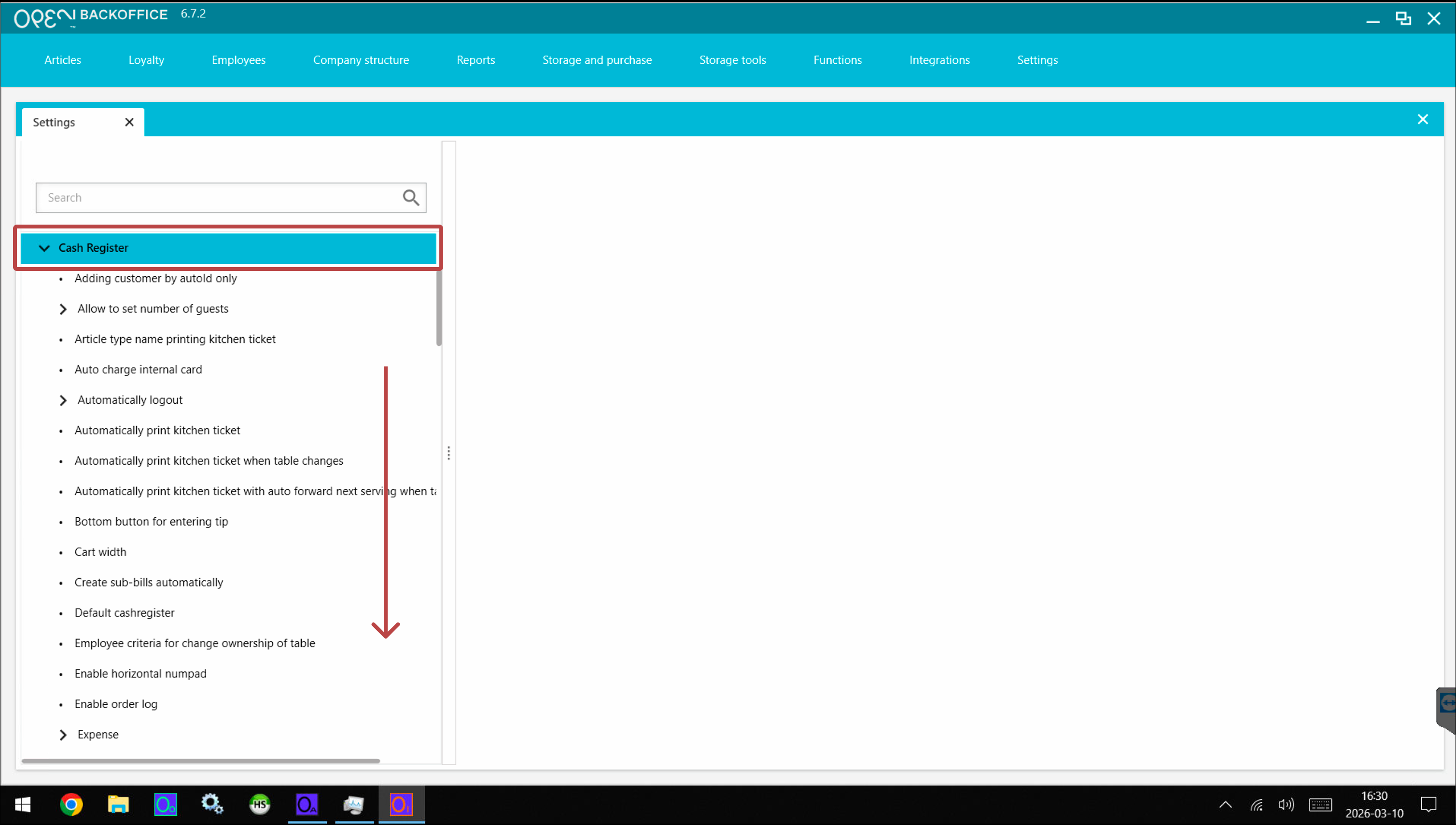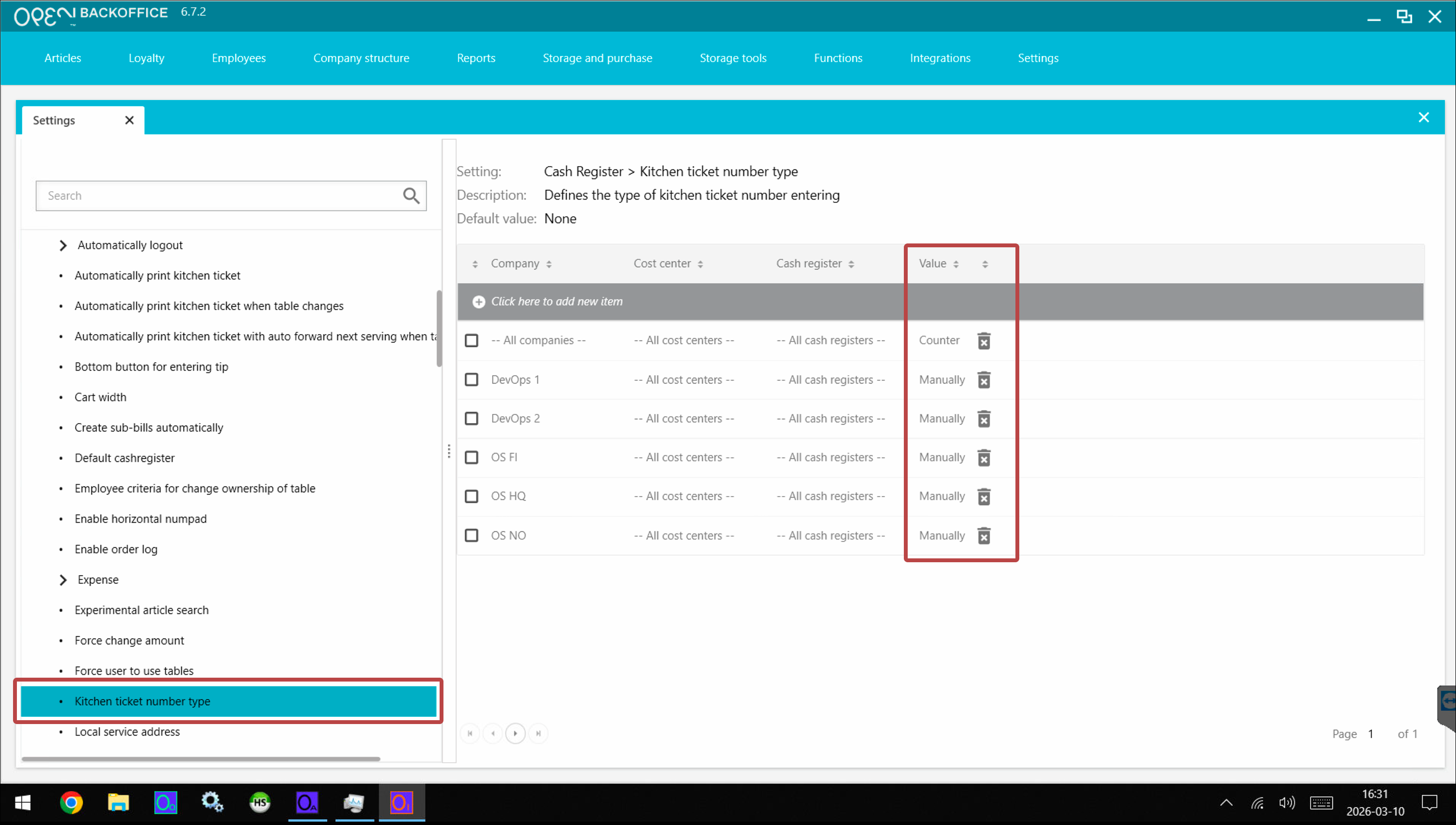 - Expand the Cash register section and scroll down to find the Kitchen ticket number type setting.