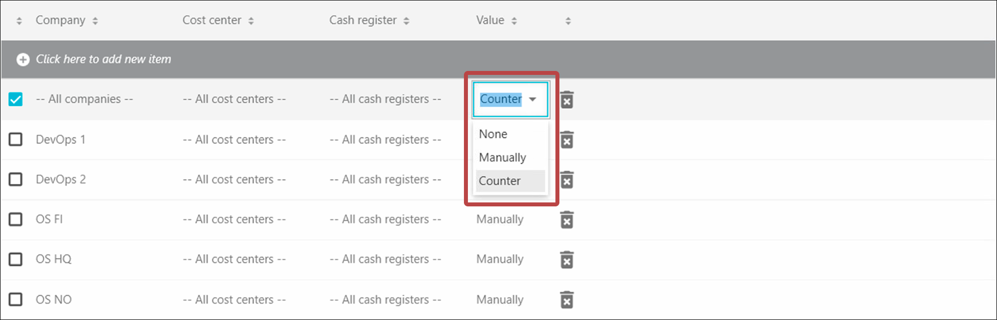 - Select an option for your company or for specific cost centers or cash registers. Choose between using a counter, manually entering an order number or not using order numbers at all.
