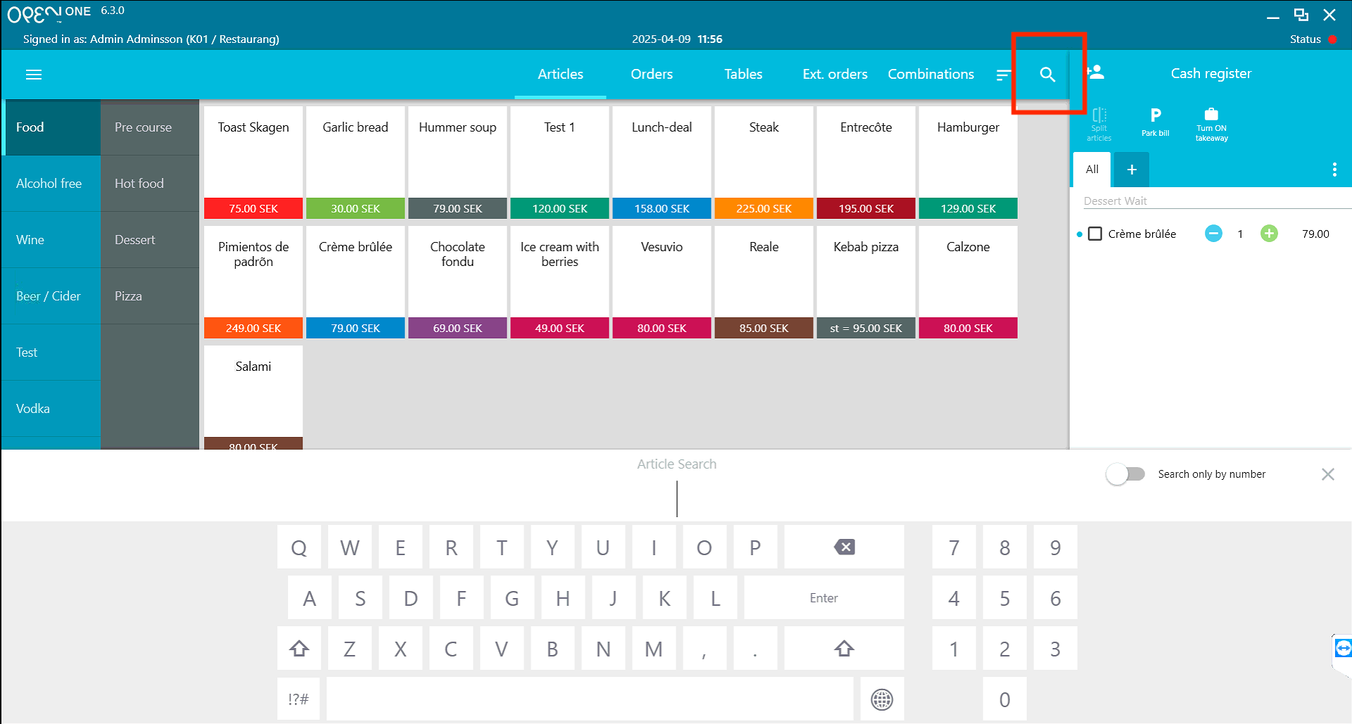 To add the article to the cash register (on the right): Click on the article to add it to the register.