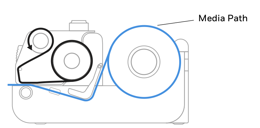 7. Feed the media underneath the print and ribbon mechanism and to the front of the printer.