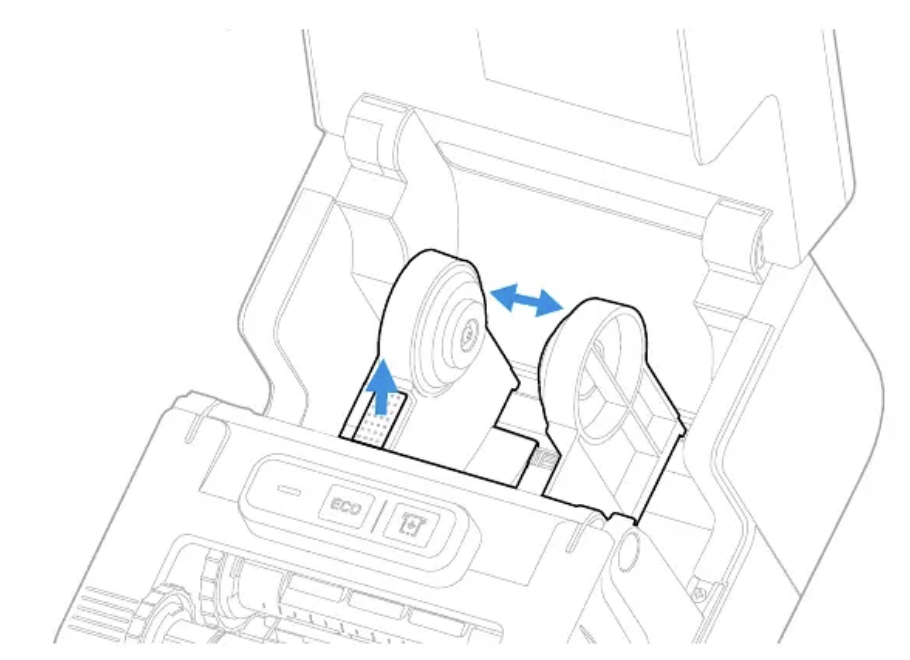 8. Place the media between the media holders, and adjust the media holders to the width of the media. Ensure the media lays flat.