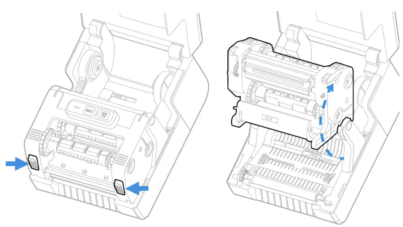 5. Press in both locking buttons to open the print and ribbon mechanism.