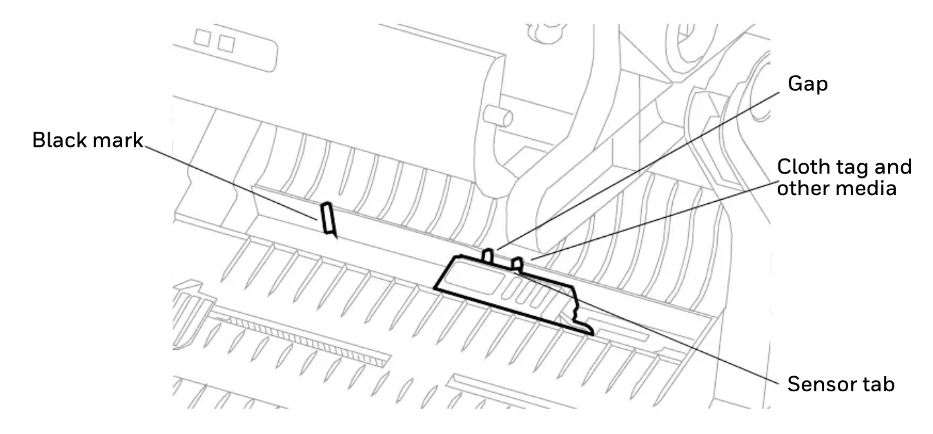 6. Adjust the media sensor according to type of media: black mark, gap, or cloth tag and other media. Slide the tab in the middle of the sensor to the location of the media type.