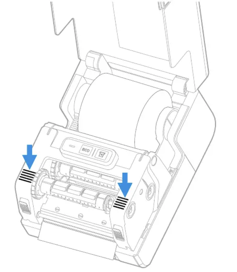9. Ensure that the media extends beyond the cutter area in front of the printer. Lower the print and ribbon mechanism and press down until both locking tabs snap into place.