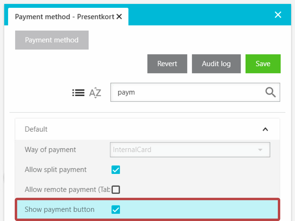 Configure this in Backoffice under Payment method for InternalCards using the new "Show payment button" setting.