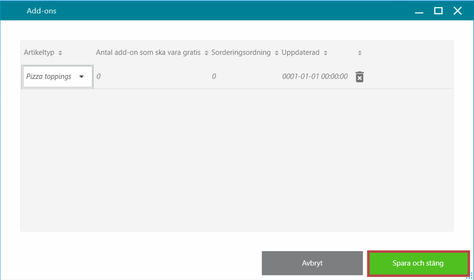 - Antal add-ons som ska vara gratis: Om t.ex. ett tillval ska vara gratis, skriv 1 i fältet.
