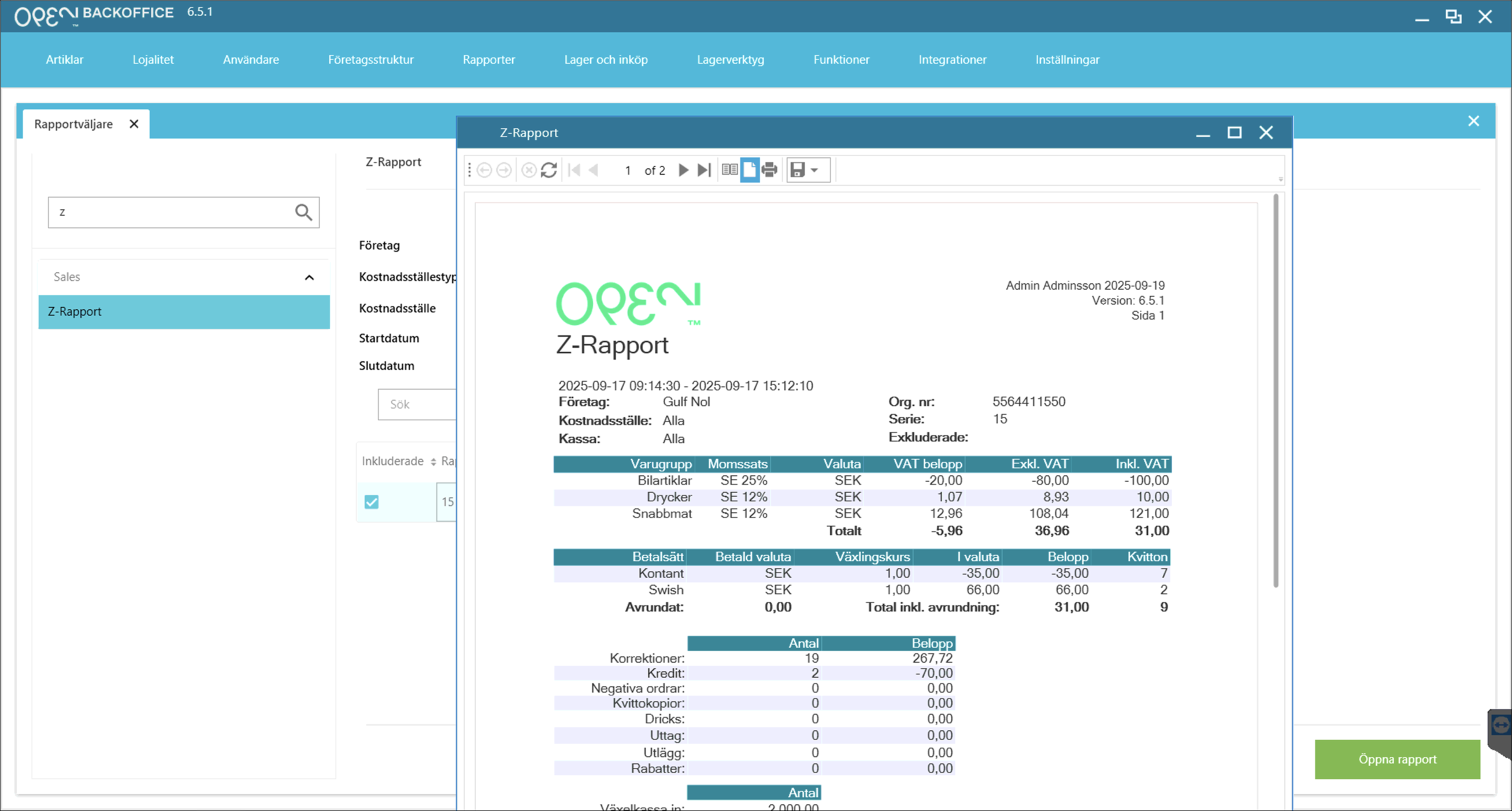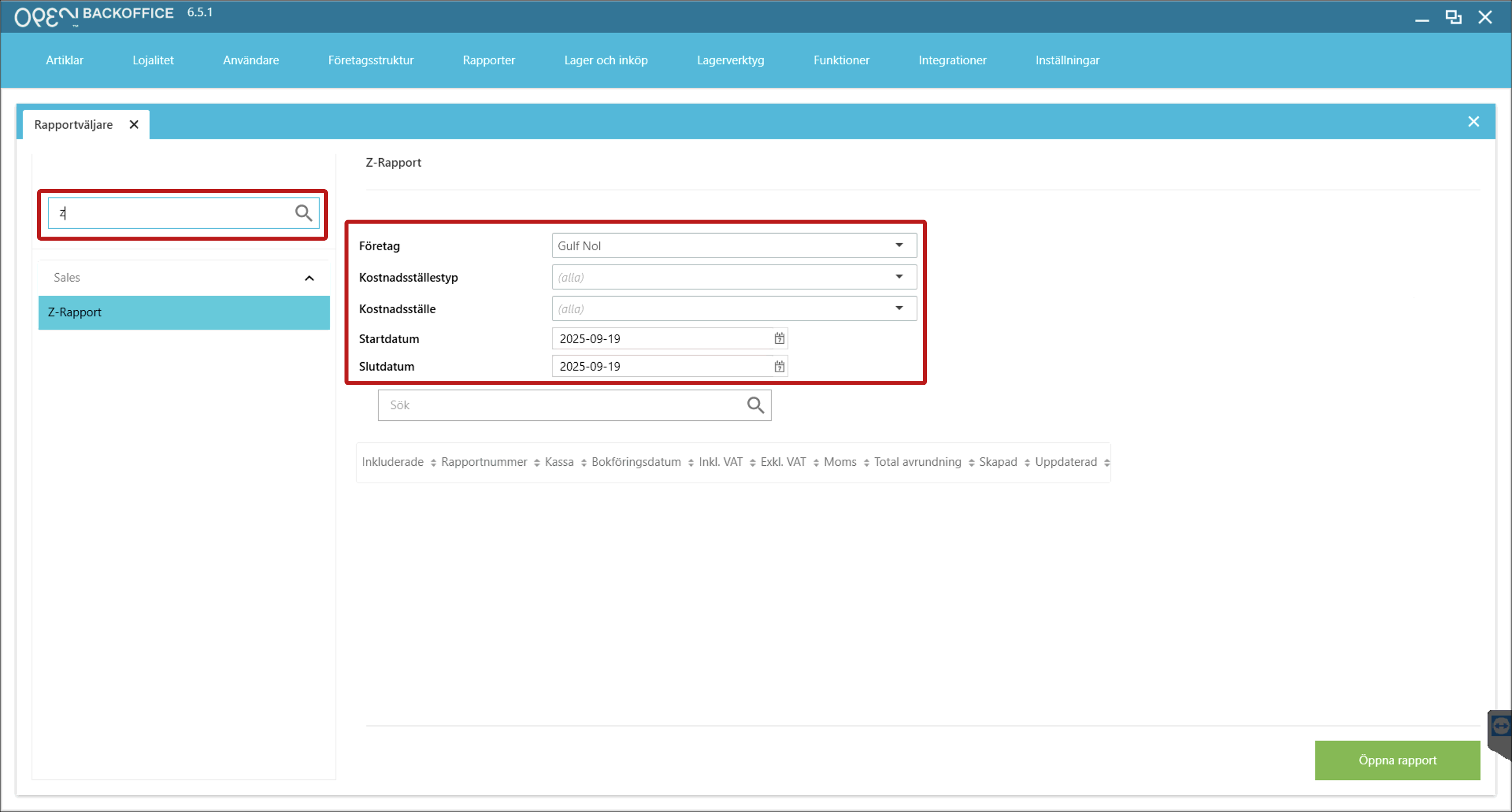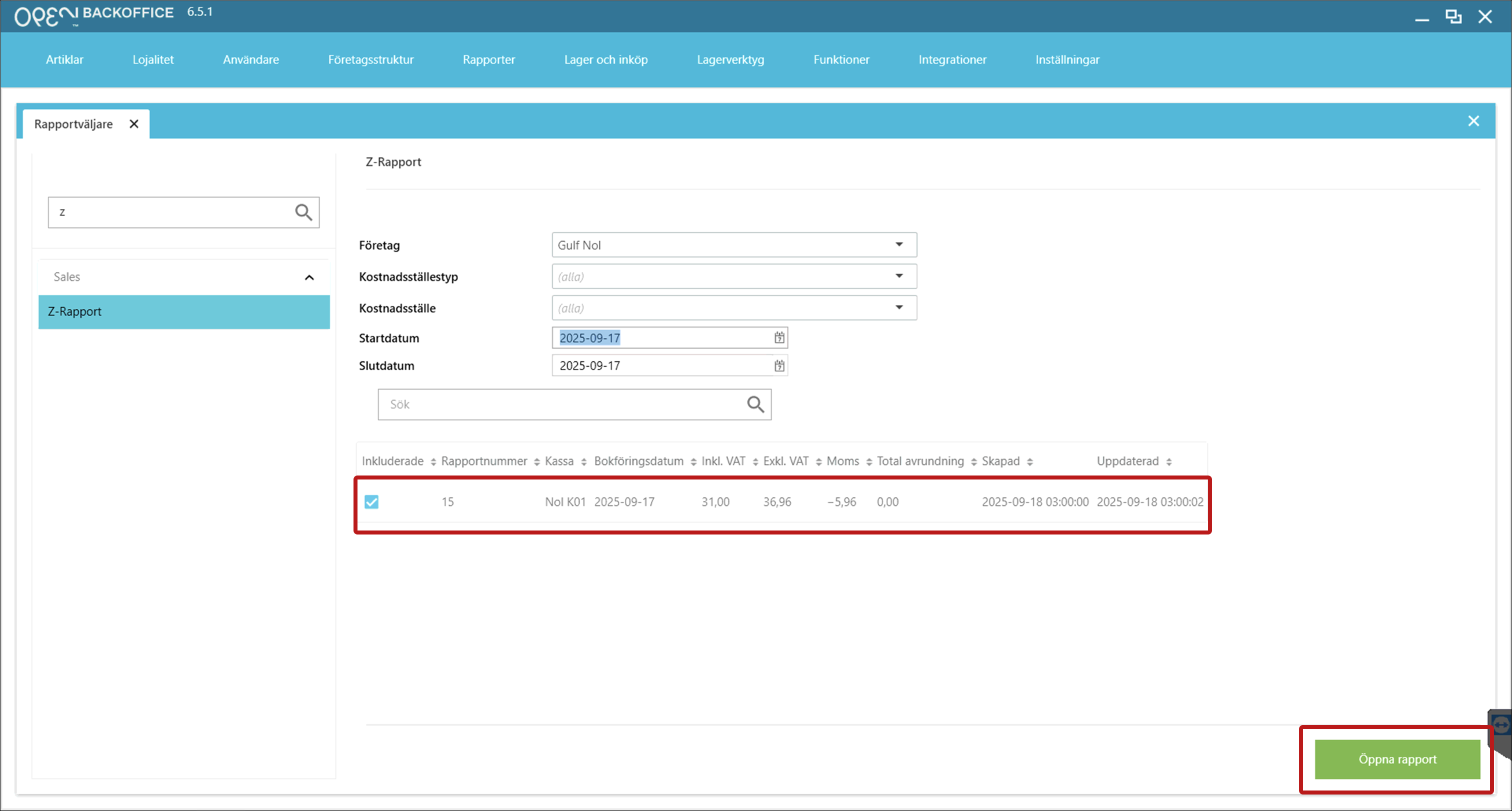 - Markera Z-rapporten du vill visa och tryck på knappen Öppna rapport.