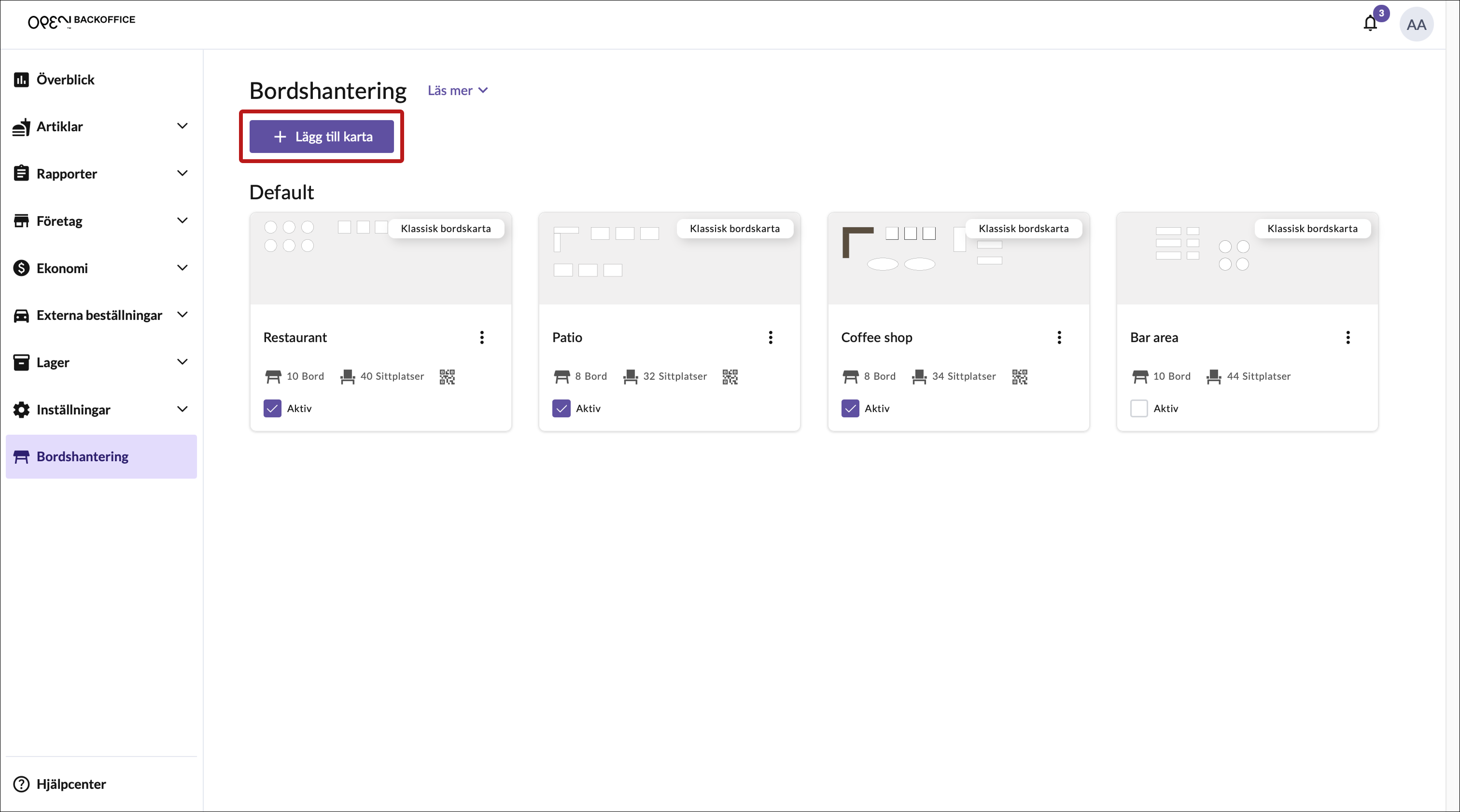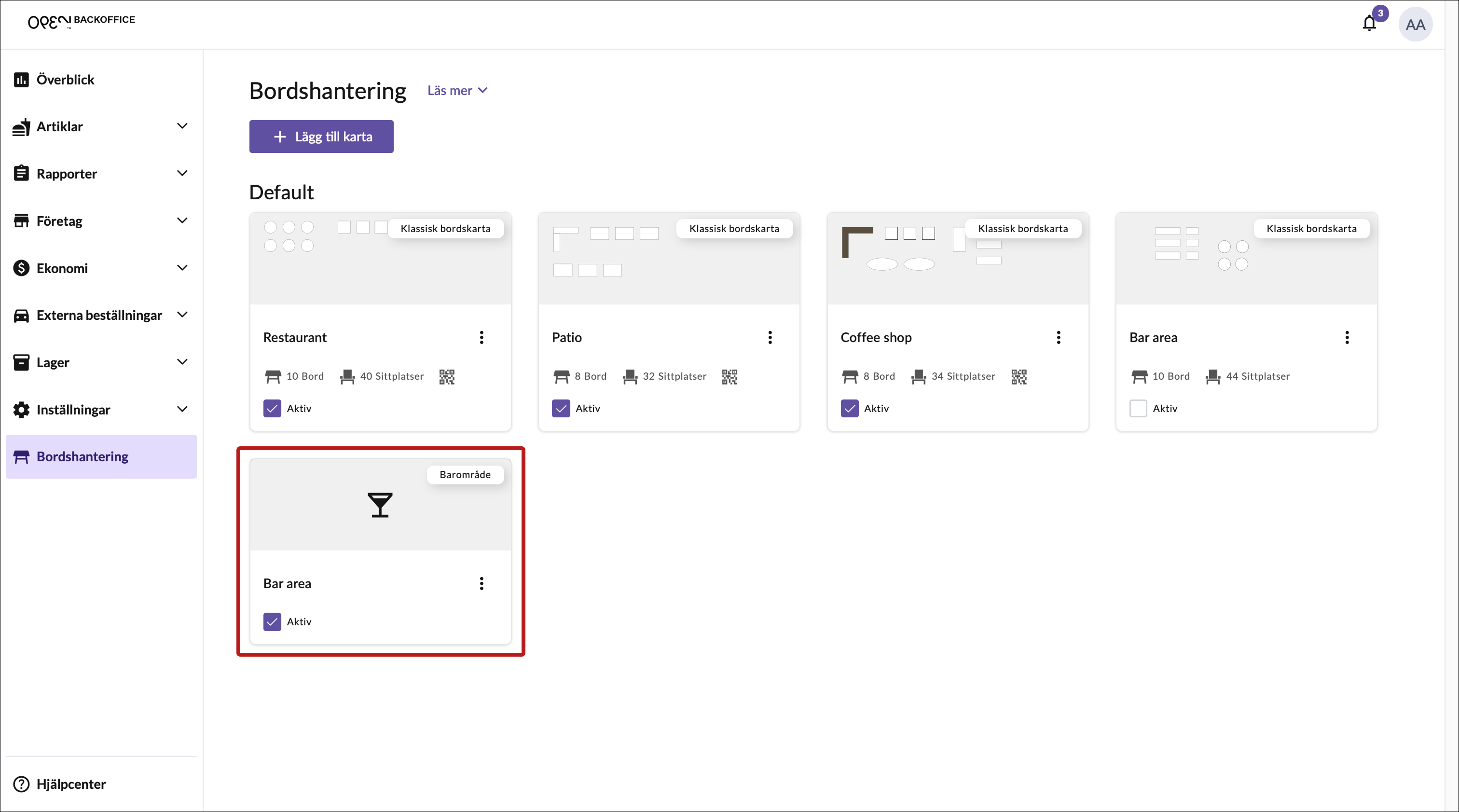 Skapa ett barområde Gå till BackOffice → Bordshantering och skapa ett nytt barområde (t.ex. Bar). Detta område kommer att innehålla alla barbeställningar som skapas från kassan.