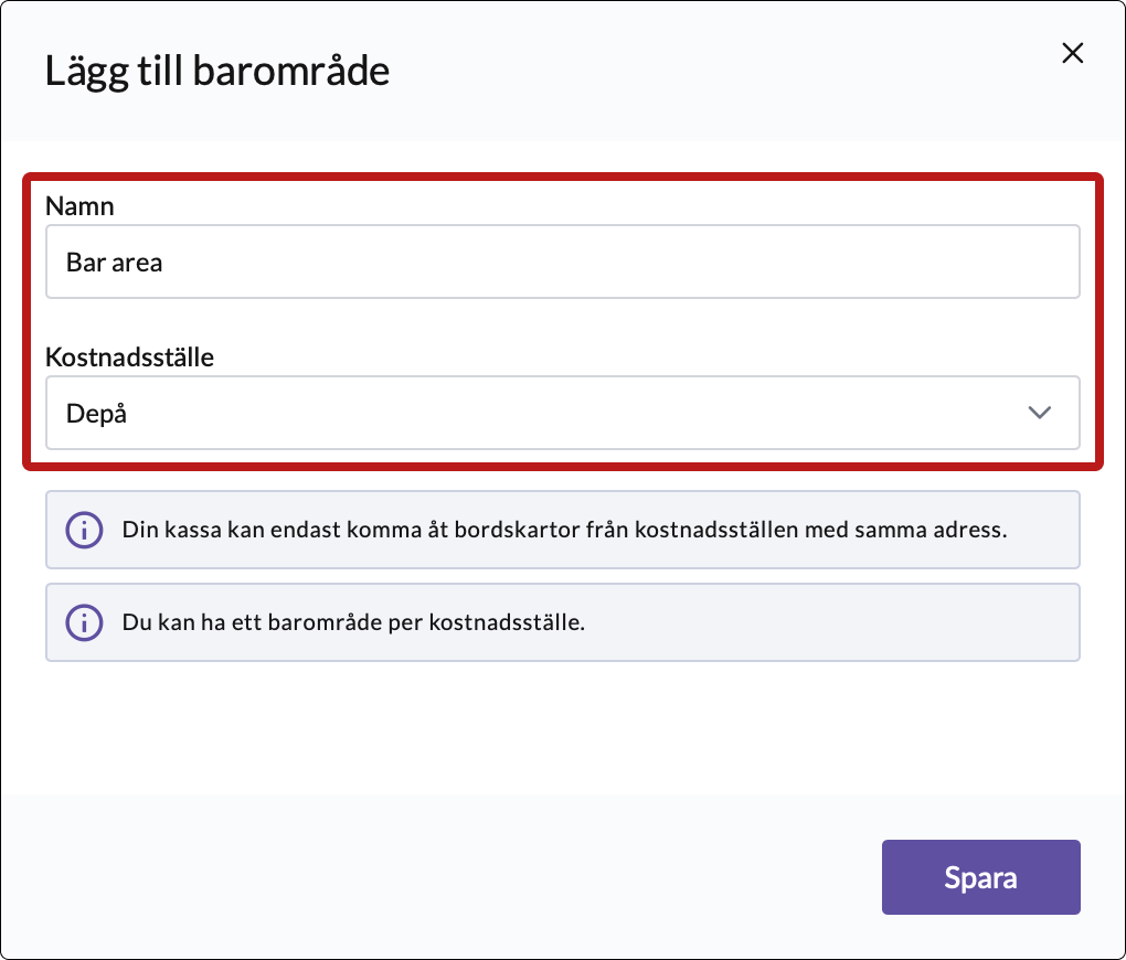 4. ✅ Klart! Ditt barområde har nu skapats.- Ange ett namn och välj ett kostnadsställe.