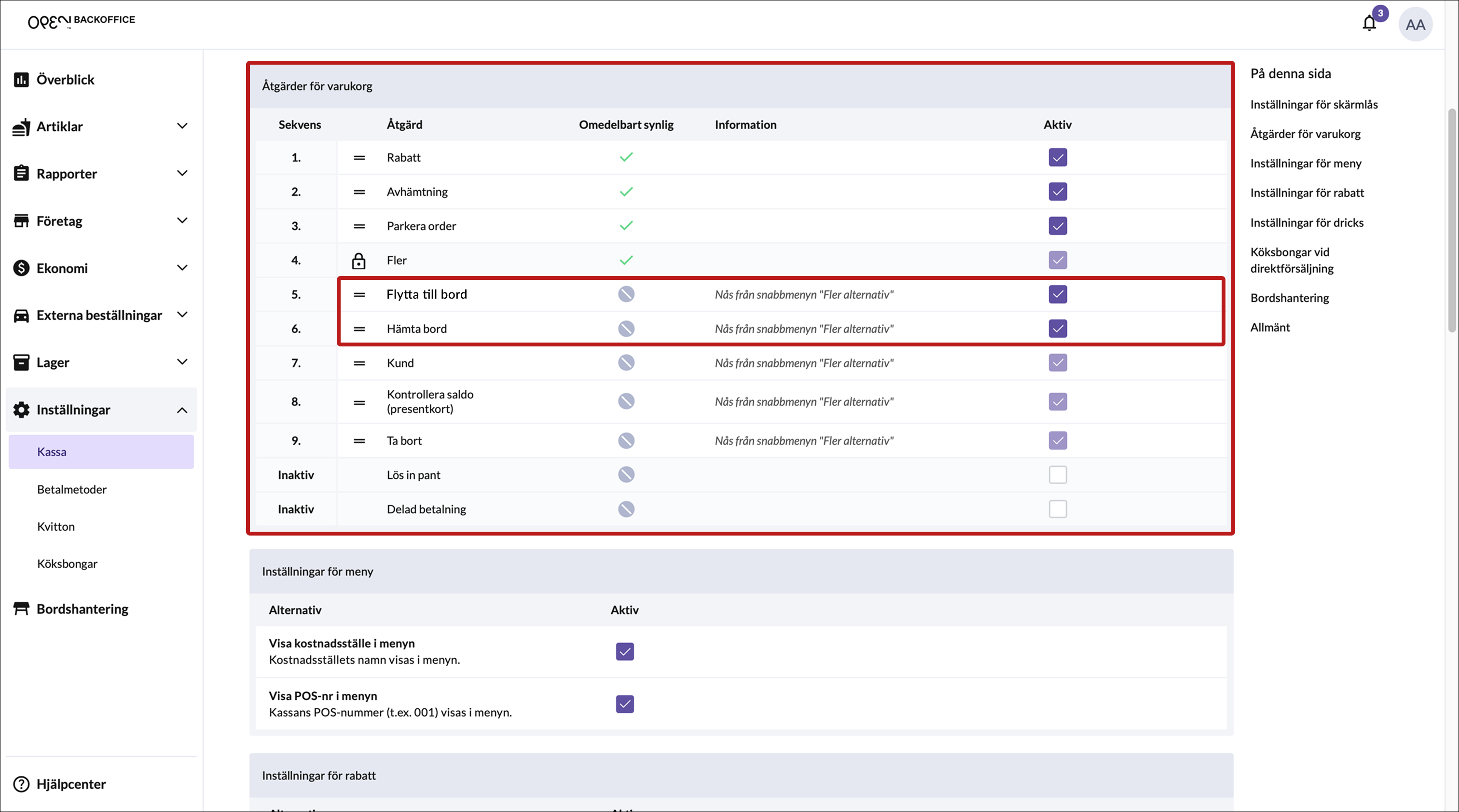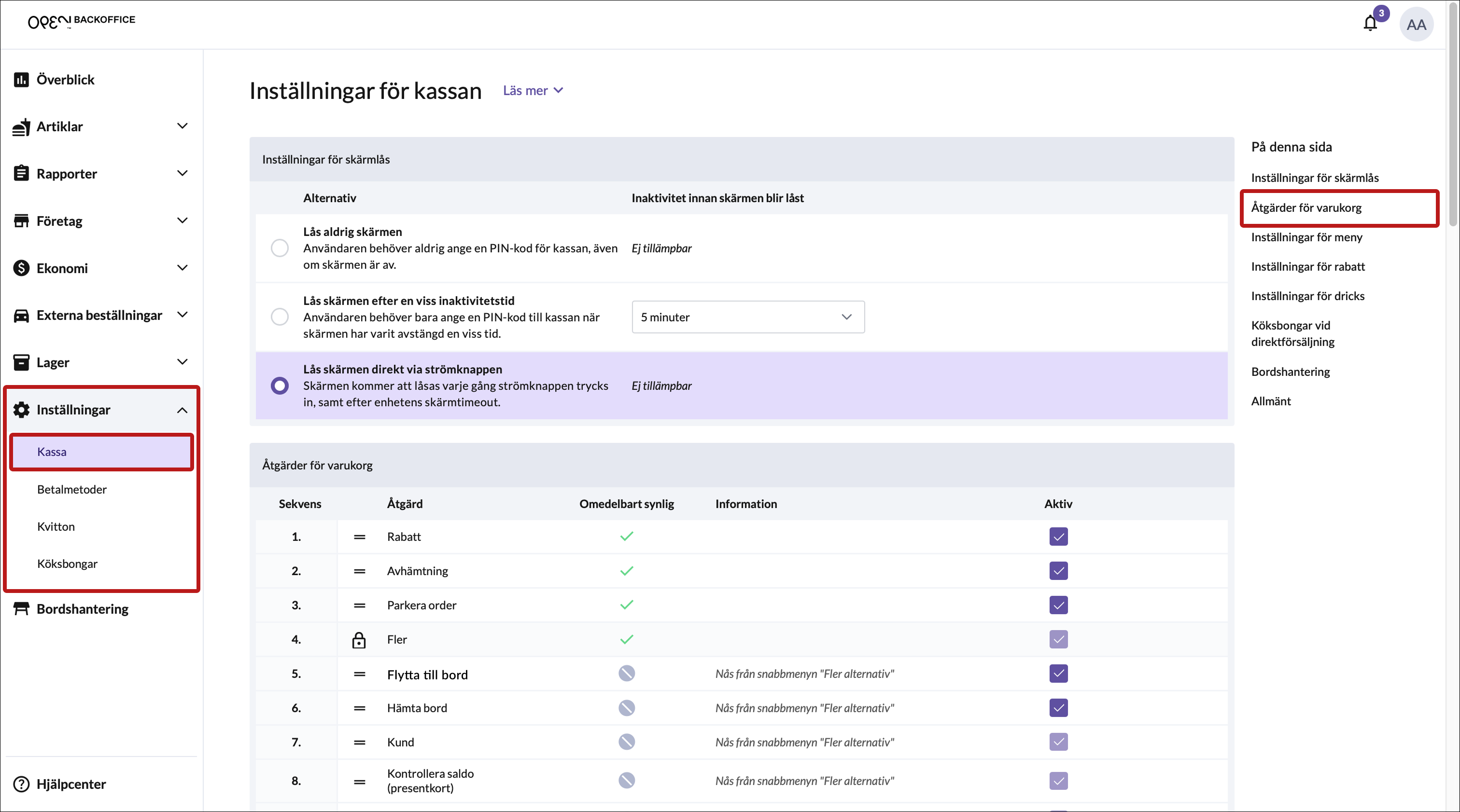 Aktivera åtgärder för varukorgen Gå till BackOffice → Inställningar → Kassa och aktivera följande åtgärder: