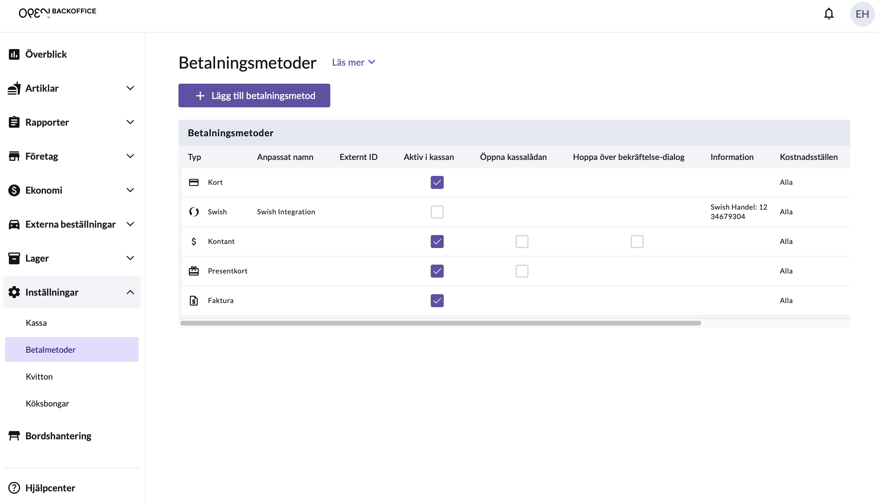 Betalsättet faktura aktiveras automatiskt på alla kostnadsställen. Detta kan ändras på sidan Betalmetoder i BackOffice.