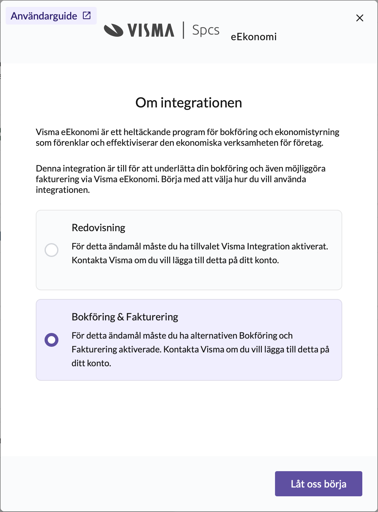 - Välj både Bokföring & Fakturering (följ stegen i guiden Aktivera Visma Spiris-integrationen med Bokföring & Fakturering nedan).