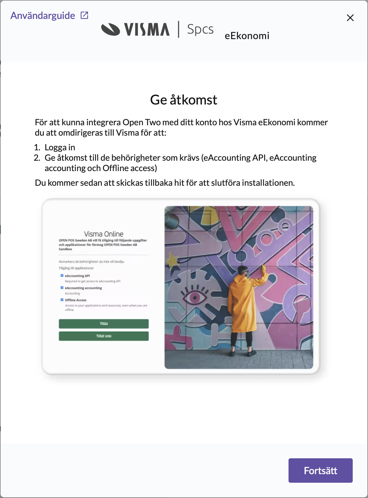 - Du behöver nu ge OPEN Two åtkomst till nödvändiga uppgifter i Visma Spiris. Tryck på OK så skickas du vidare till Visma Spiris.
