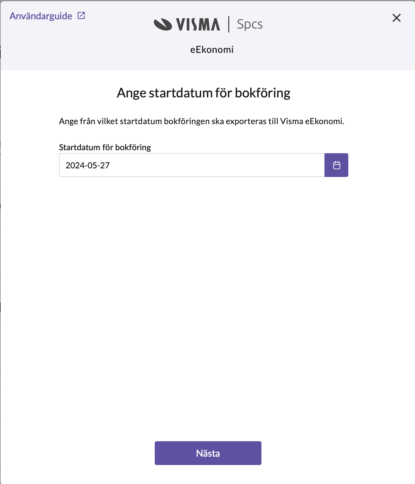 - Fyll i startdatum från när din försäljningsdata ska exporteras till Visma Spiris för att bokföras. Tryck sedan på NÄSTA.