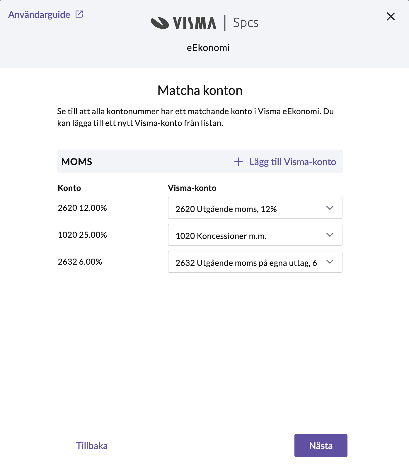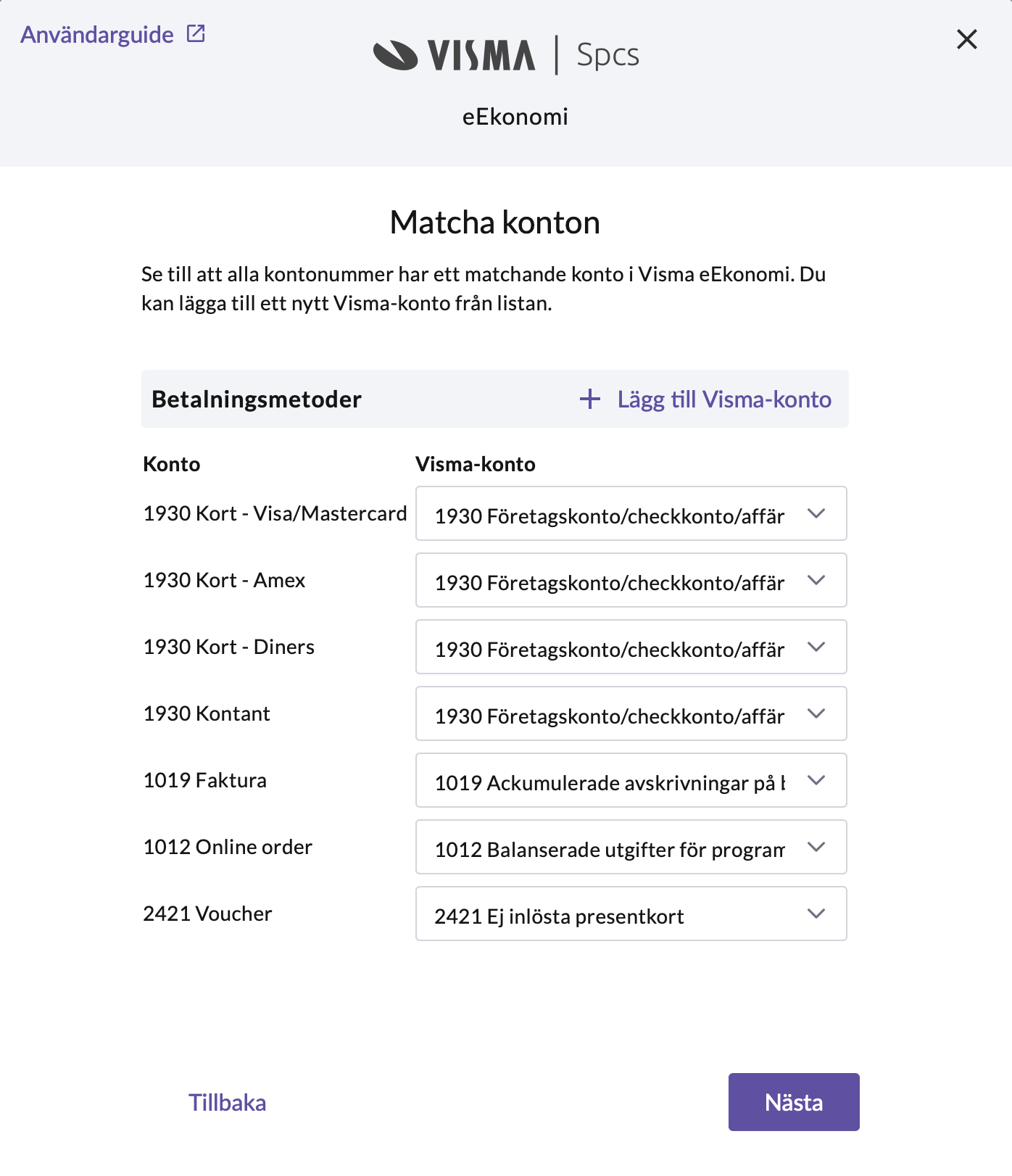 Välj vilka bokföringskonton som ska användas i Visma Spiris för dina olika betalningsmetoder. Du kan även lägga till ett nytt konto från listan. Tryck sedan på NÄSTA.