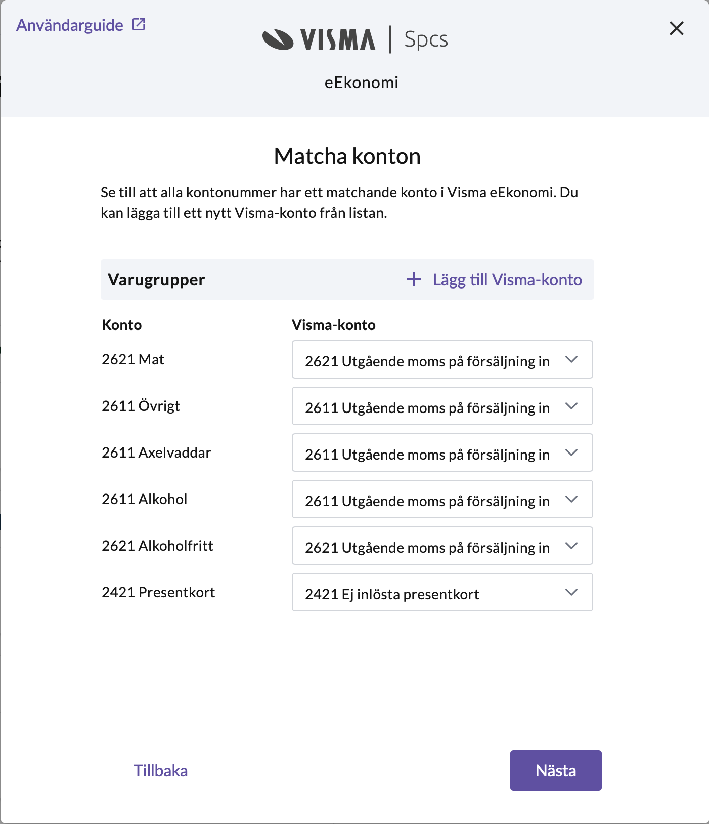 Välj vilka bokföringskonton som ska användas i Visma Spiris för dina olika varugrupper. Du kan även lägga till ett nytt konto från listan. Tryck sedan på NÄSTA.