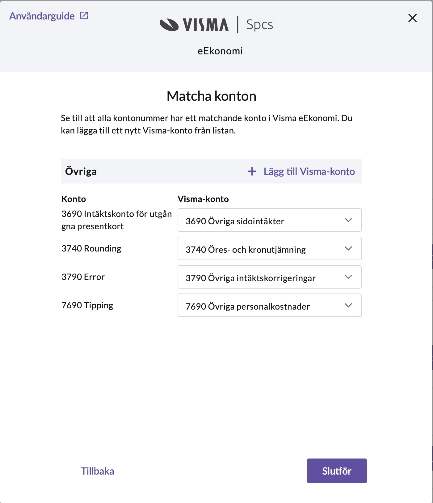 Välj vilka bokföringskonton som ska användas i Visma Spiris för dina övriga händelser, t.ex. bokföring av dricks. Du kan också lägga till ett nytt konto från listan.