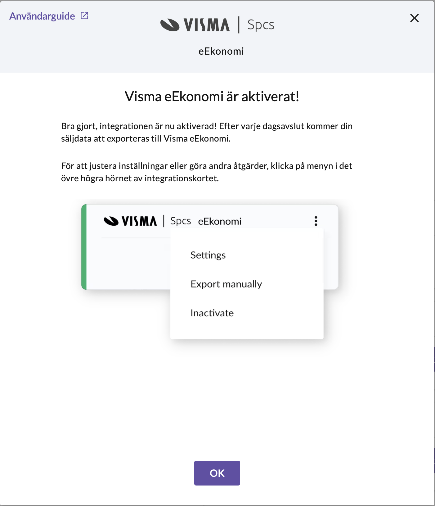 - Nu är Visma Spiris-integrationen aktiverad. Tryck på OK för att stänga ner dialogen.