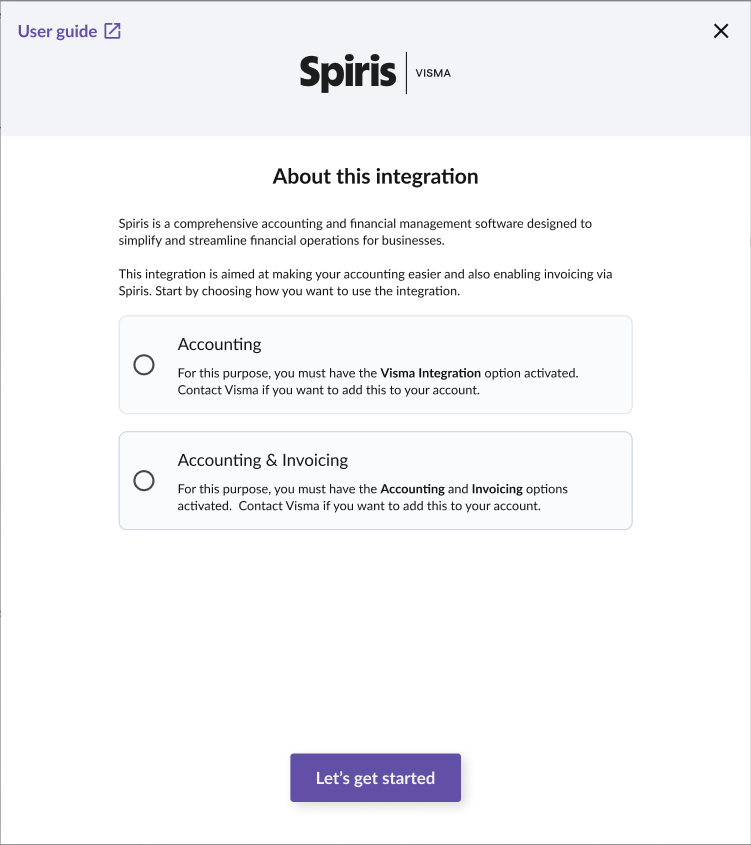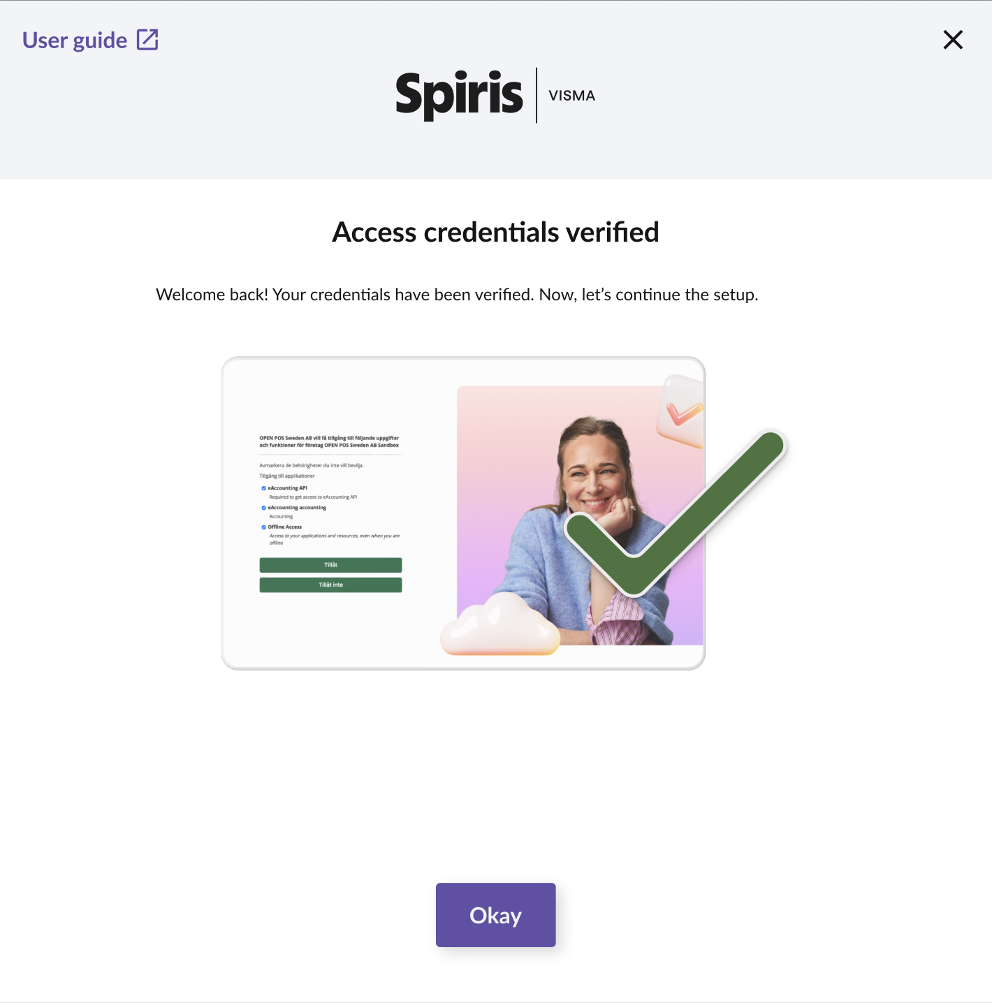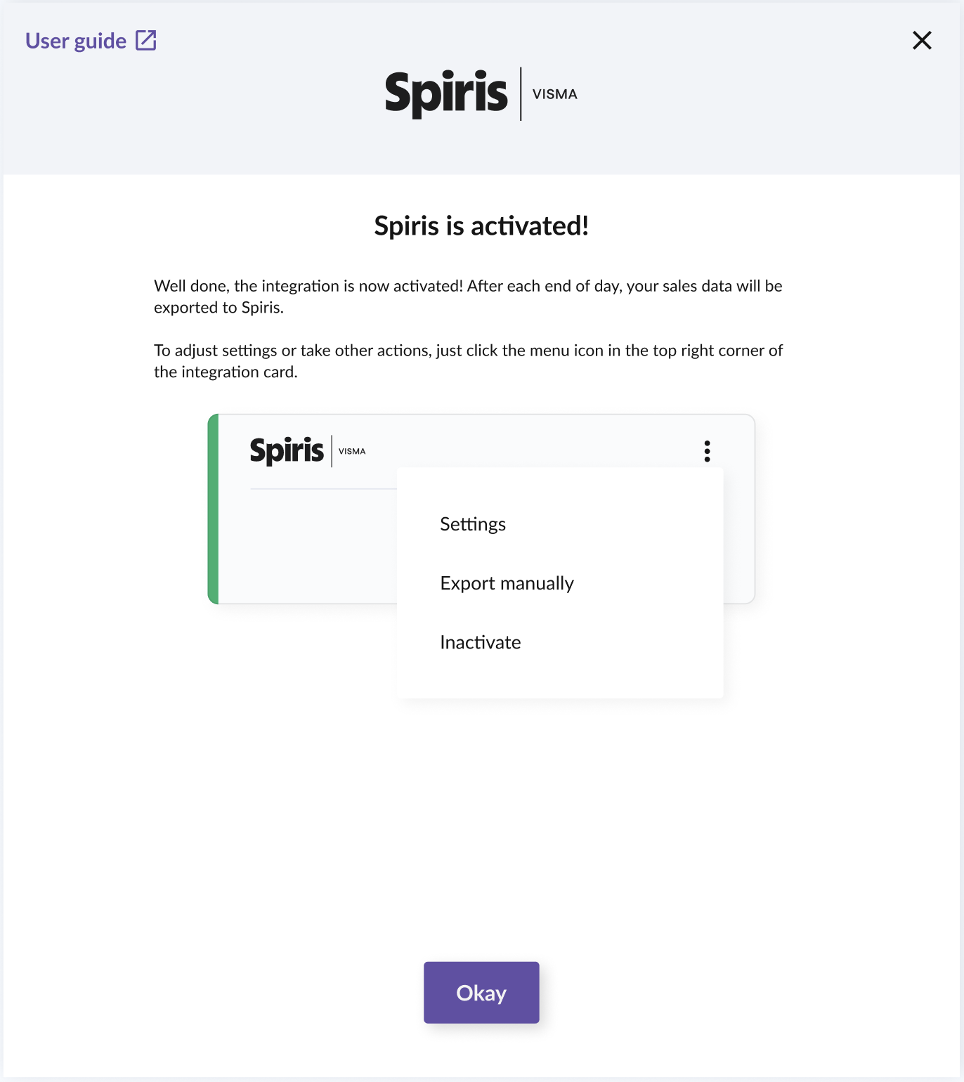 - Once you have chosen all bookkeeping accounts, the Spiris integration is activated. Press OK to close the dialog.