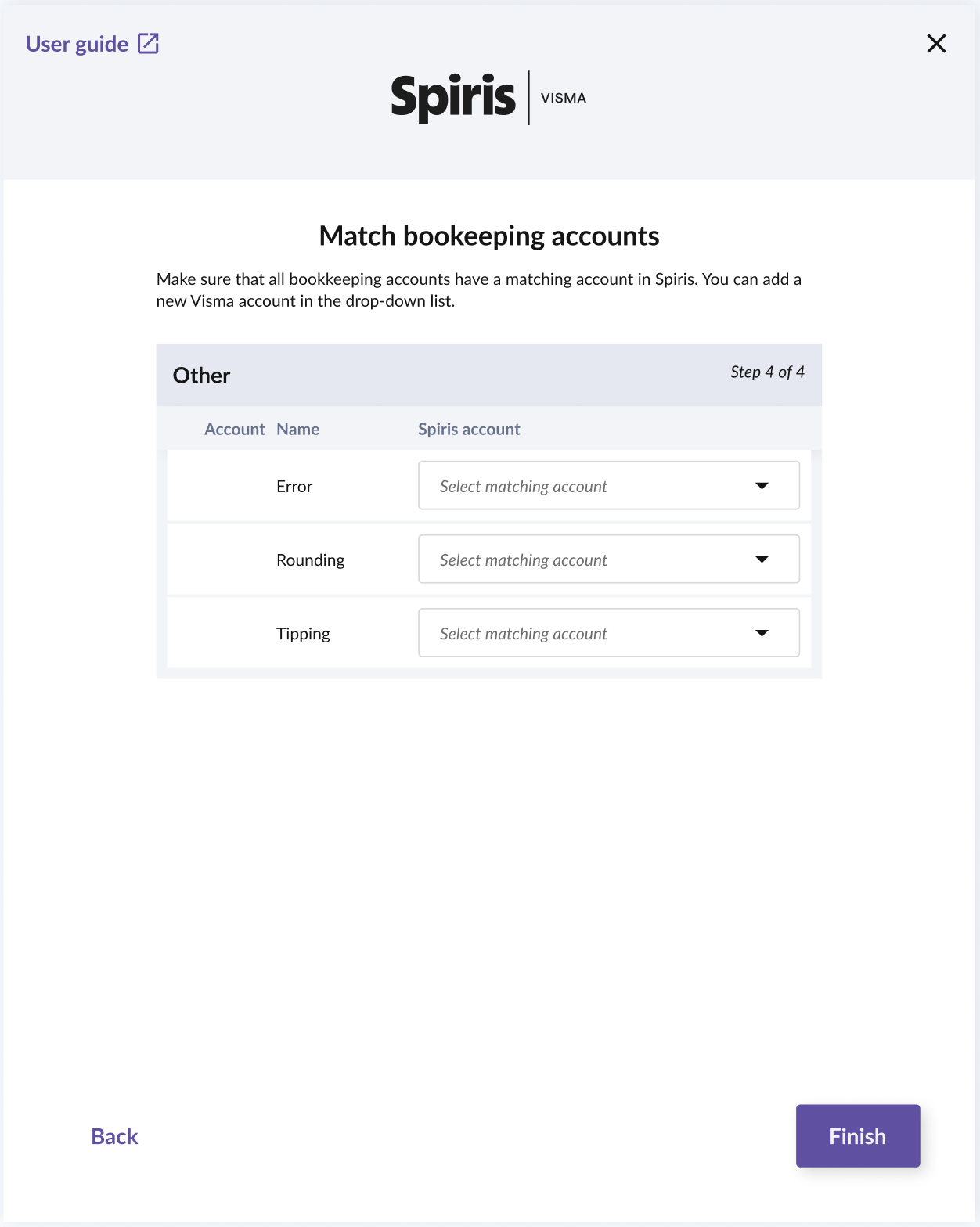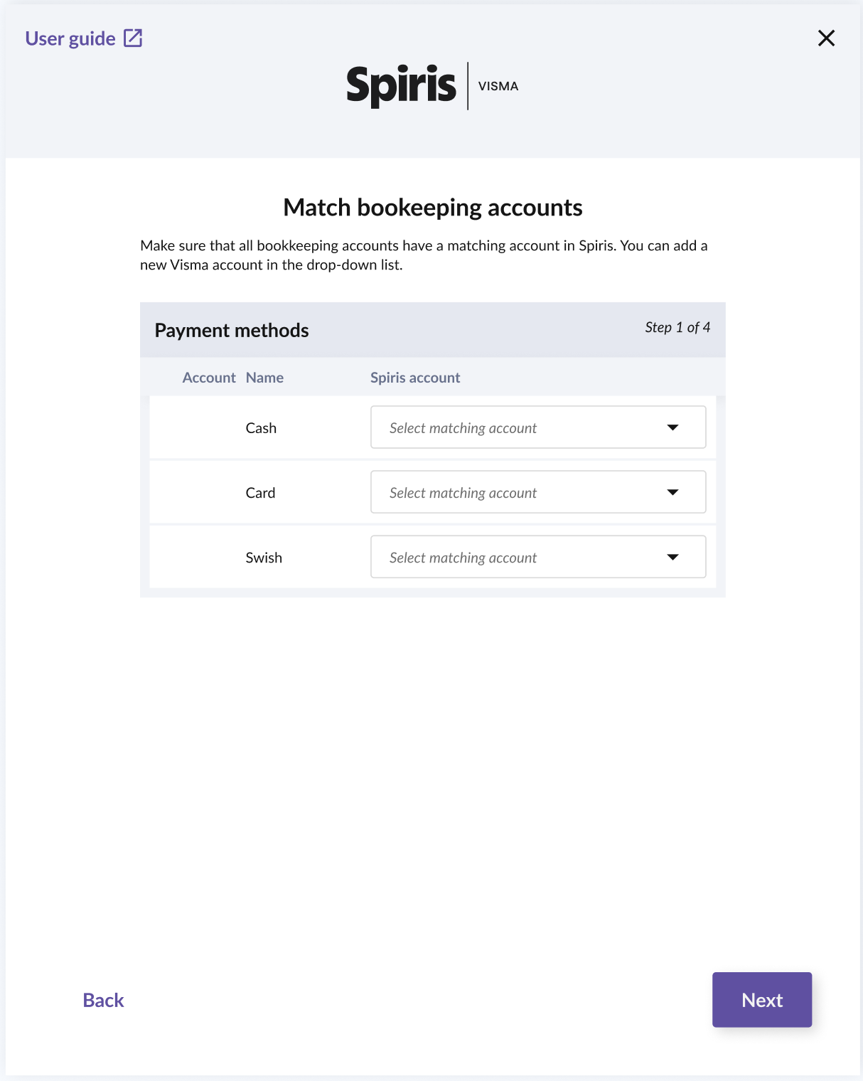 - Select bookkeeping accounts for payment methods Choose which bookkeeping accounts to use in Spiris for your various payment methods. You can also add a new account from the list. Then press NEXT.