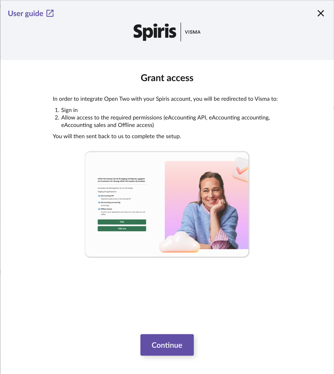 In order to integrate OPEN Two with Spiris, you will be redirected to Spiris to log in and grant access to the required permissions. You are then sent back to BackOffice to continue the activation. Press CONTINUE.