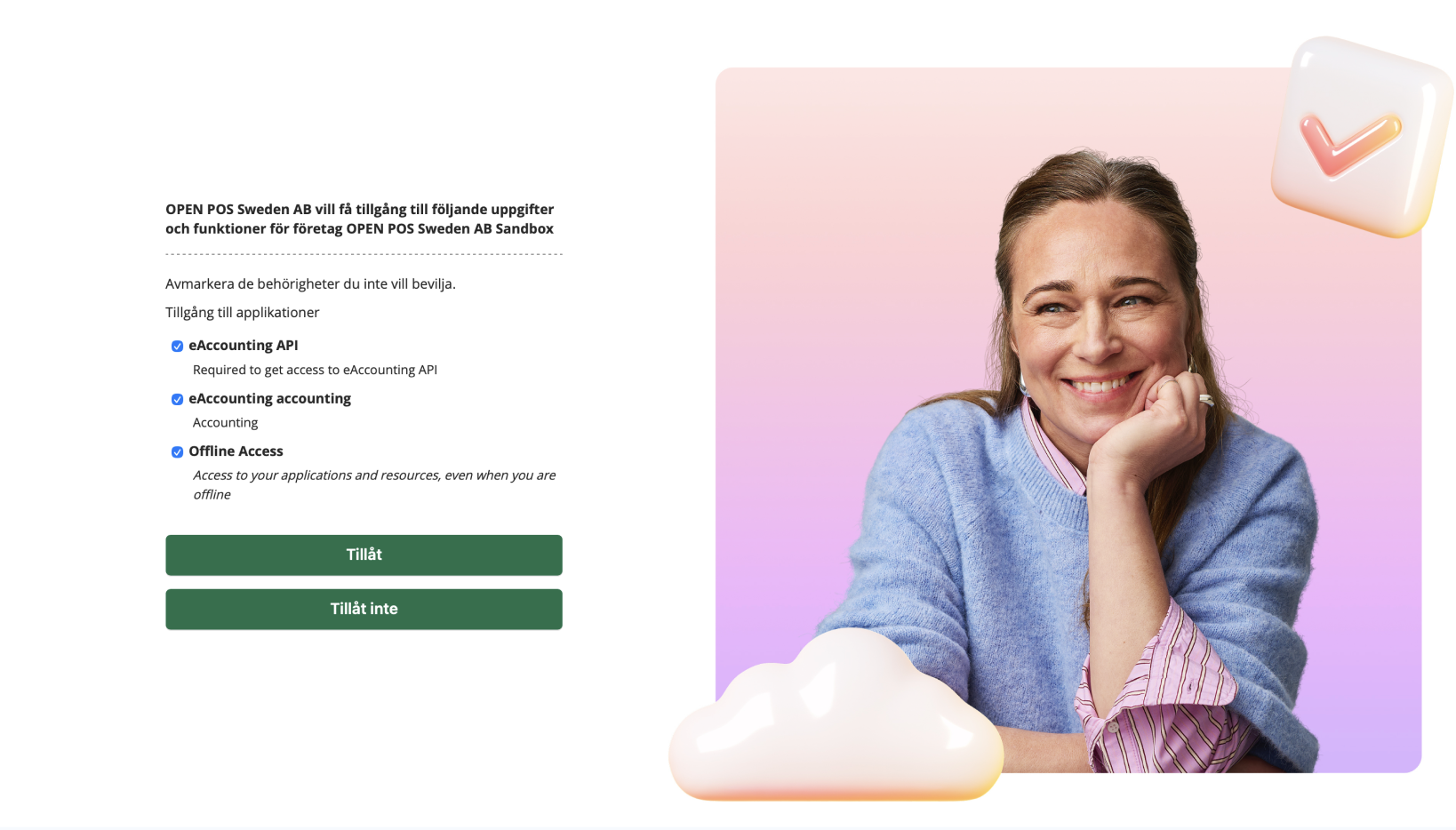 - Make sure the checkboxes for eAccounting API, eAccounting accounting and Offline Access are checked. Then press YES, Allow.
