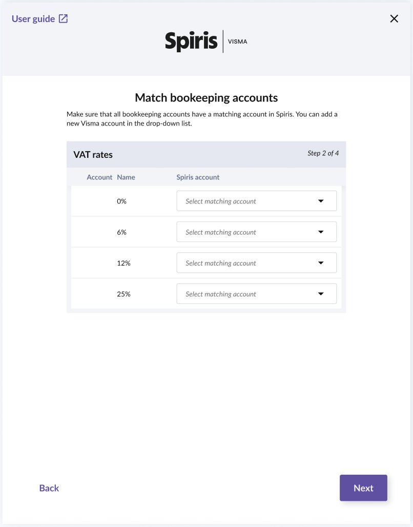Choose which bookkeeping accounts to use in Spiris for your various VAT-rates. You can also add a new account from the list. Then press NEXT.