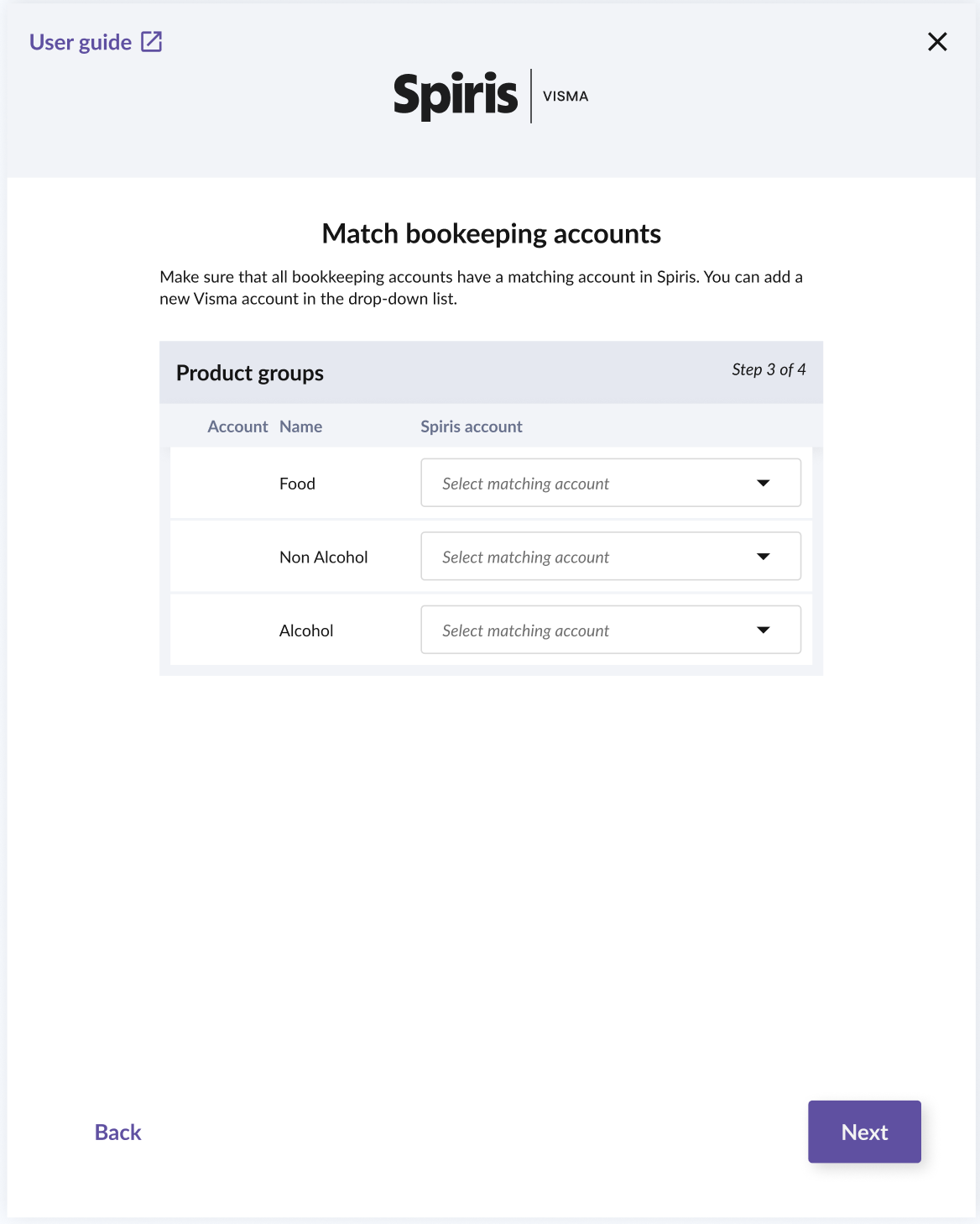 Choose which bookkeeping accounts to be used in Spiris for your various product groups. You can also add a new account from the list. Then press NEXT.