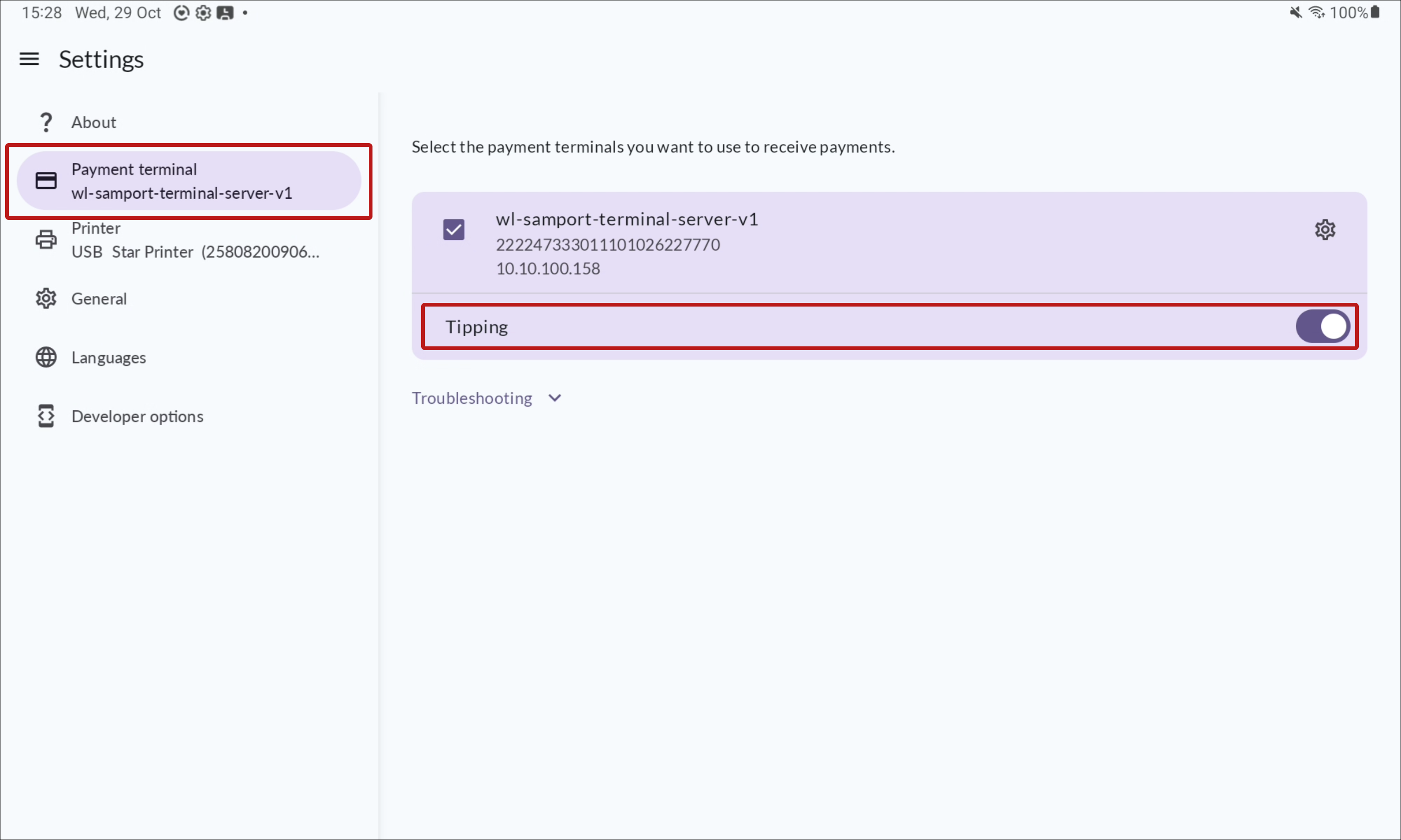If tipping is enabled in BackOffice ('Percentage' or 'Total amount' is selected), you can configure tipping separately for each payment terminal. This means: