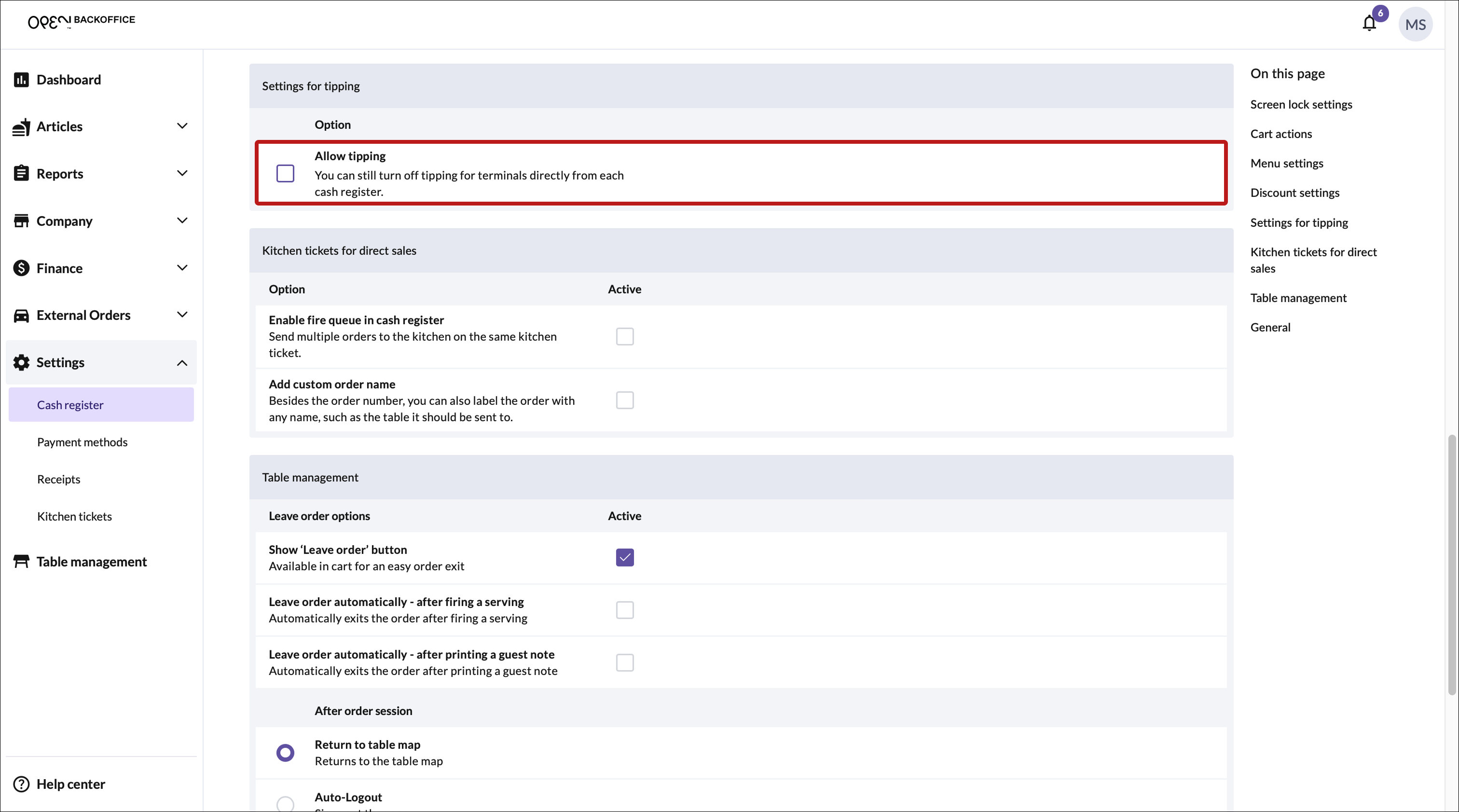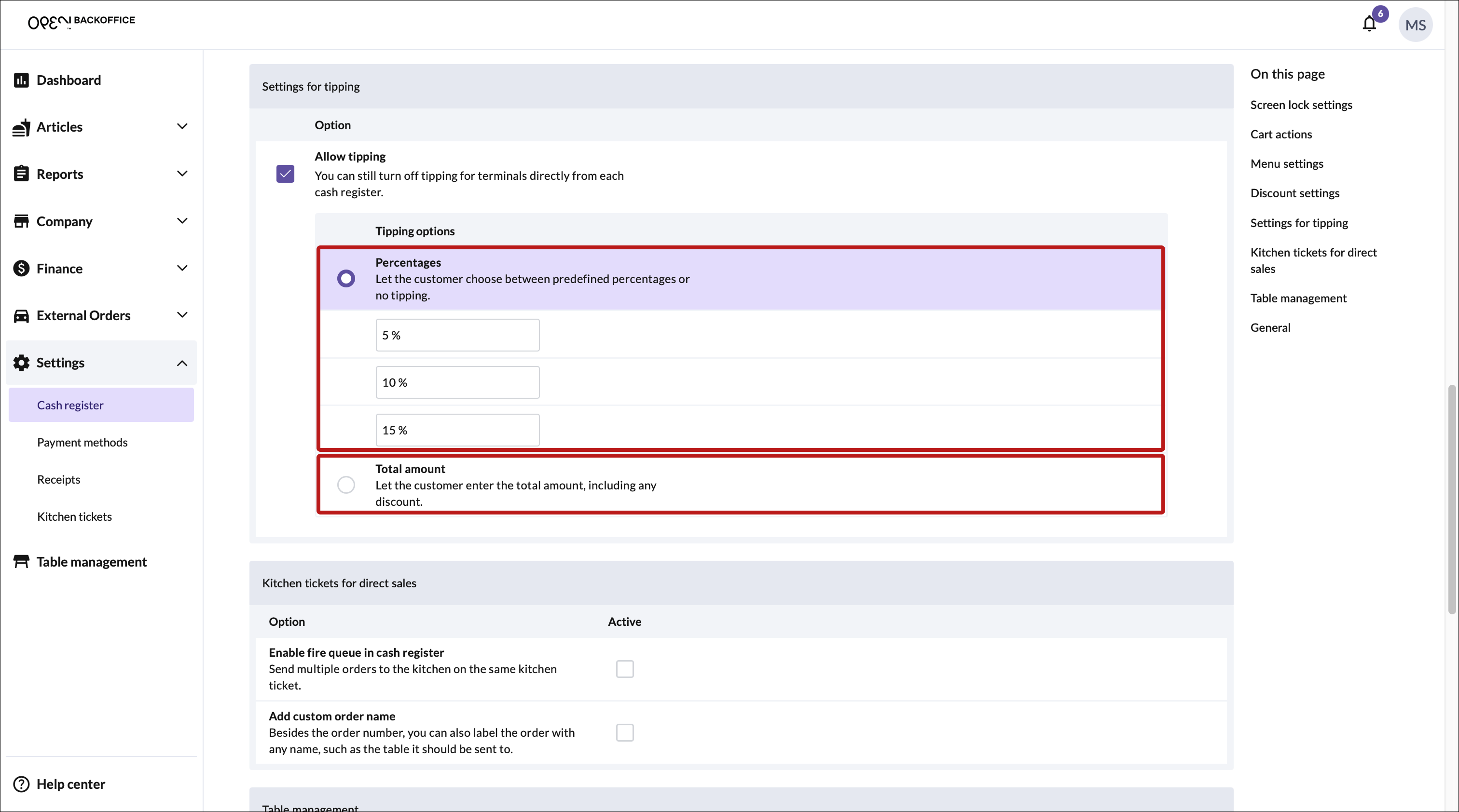 - Enable or disable tipping for the payment terminal(s) linked to that cash register.