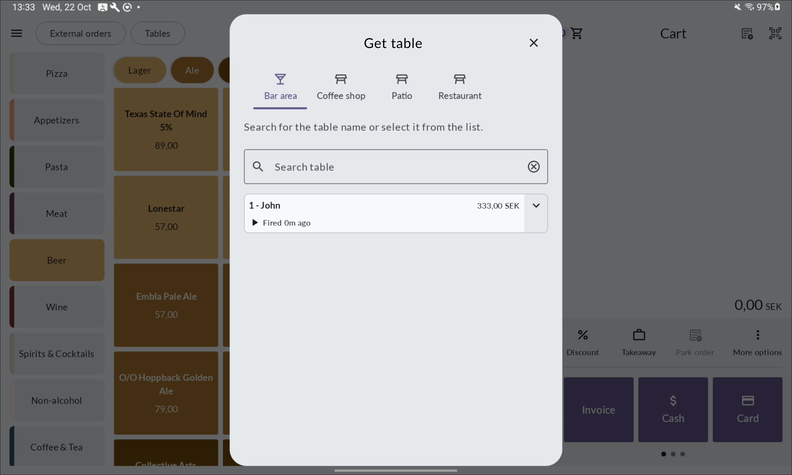 - “Tables” in the Bar area represent open bar tabs. Even though they’re not tied to physical tables, they’re managed in the same familiar way.