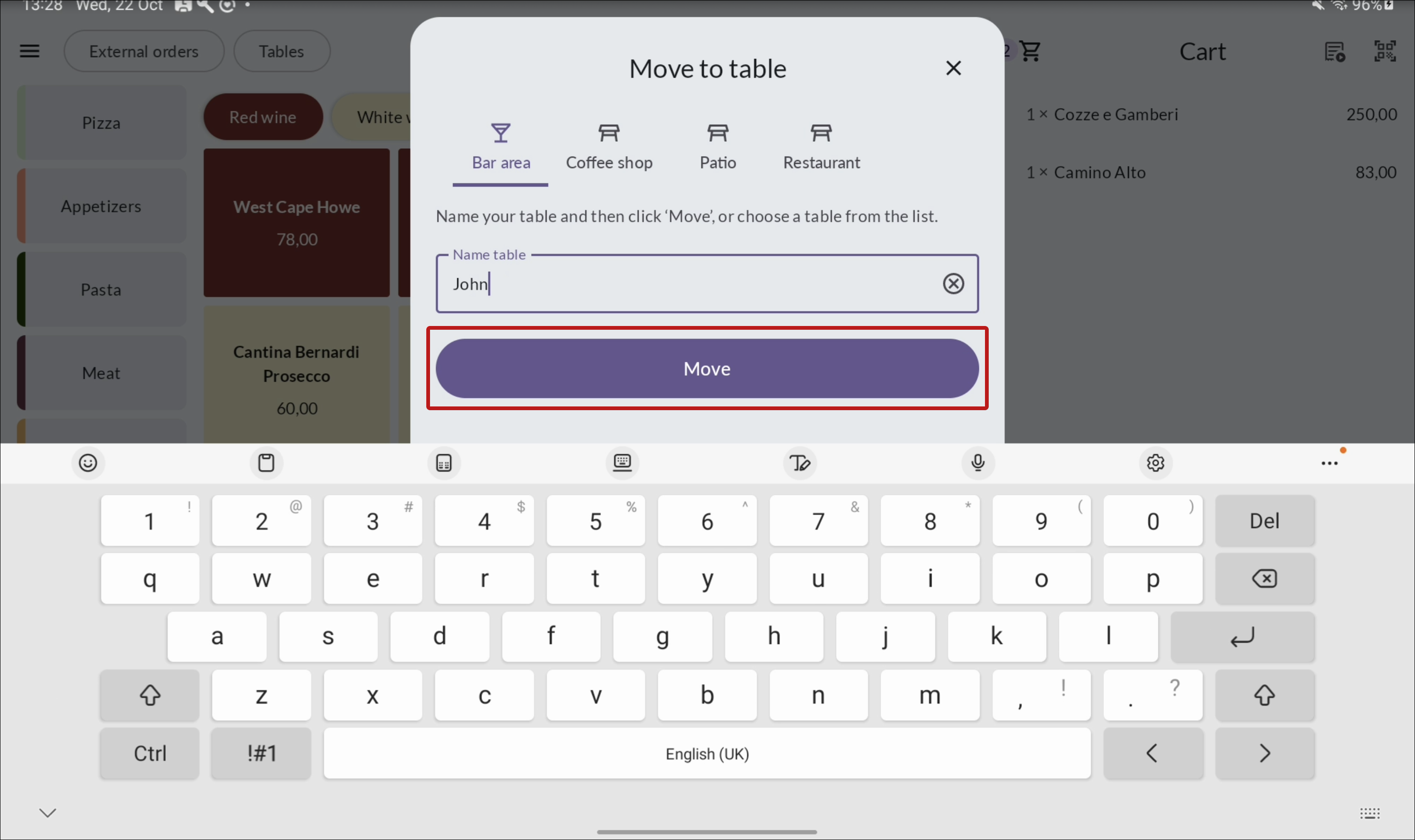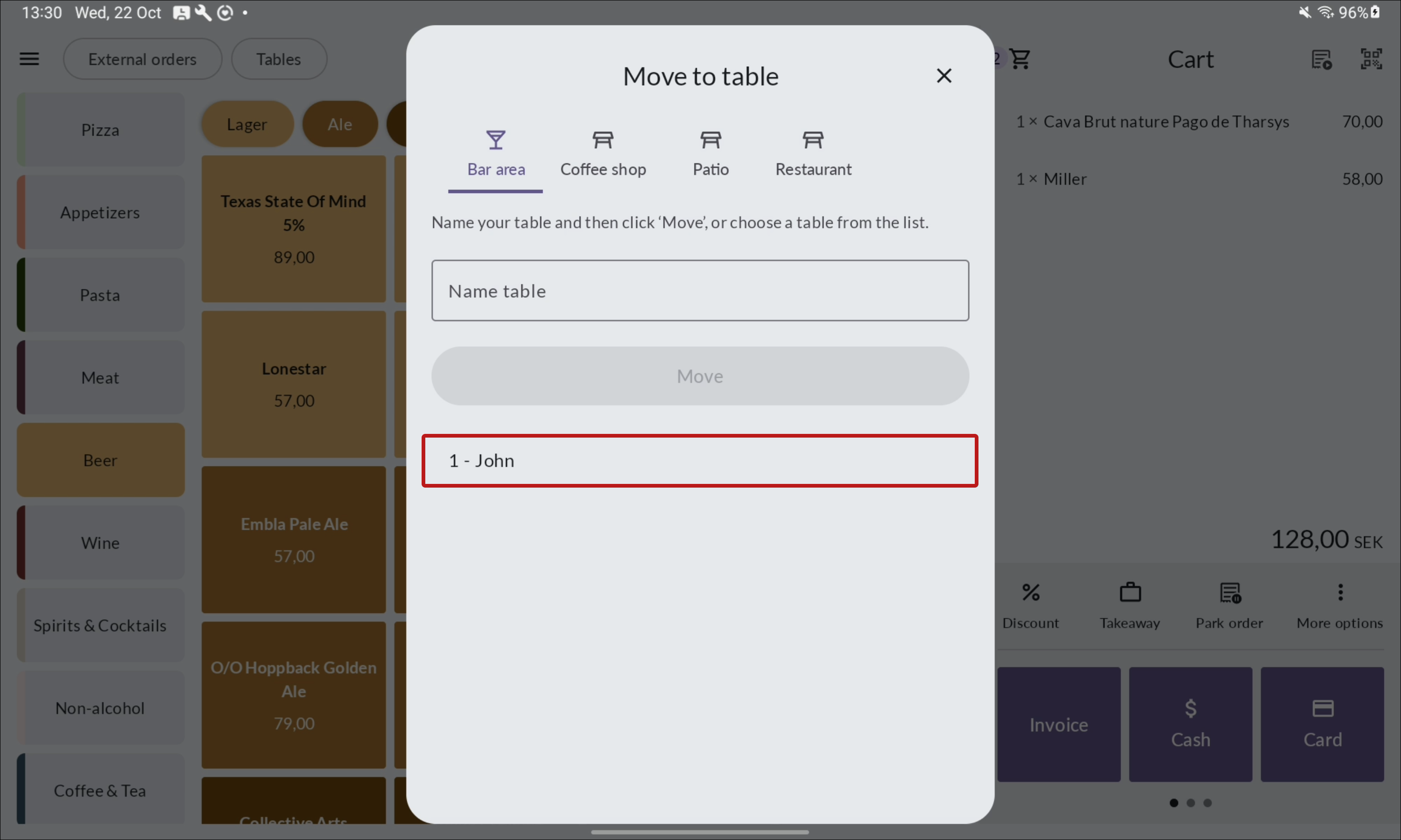 When a guest orders at the bar and wants to keep an open bill, you can move their items to a named bar tab.