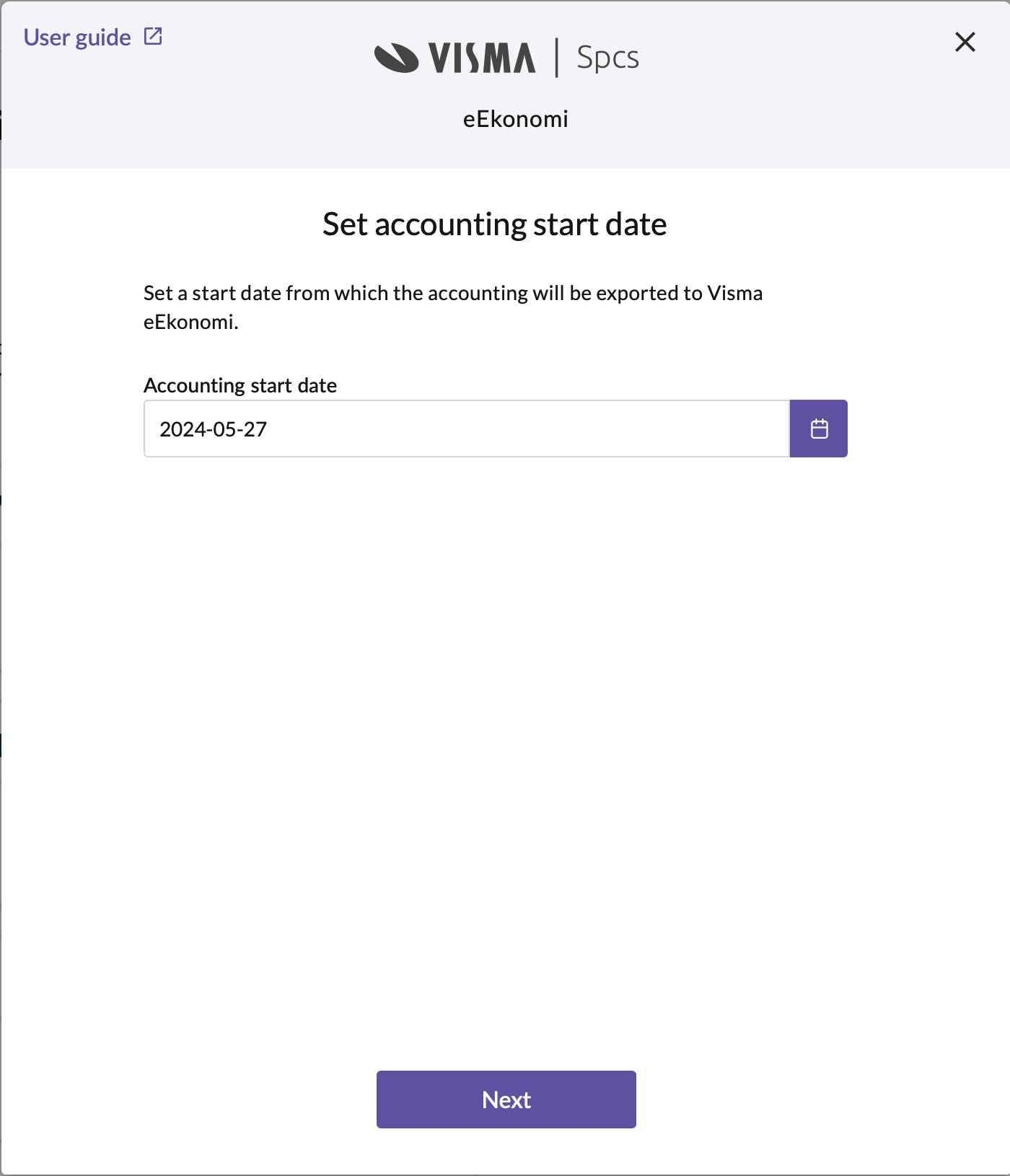 - Fill in the start date from when your sales data should be exported to Visma Spiris for posting. Then press NEXT.