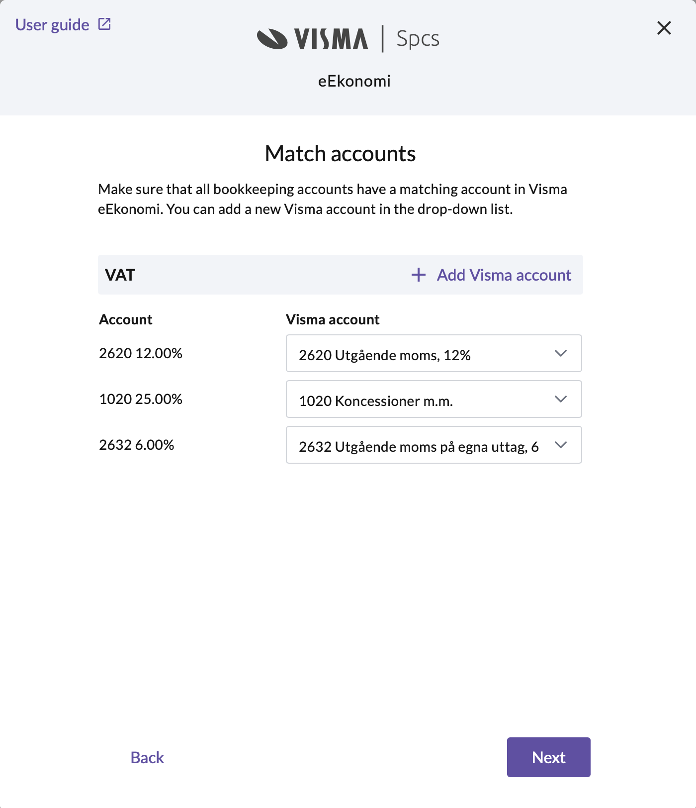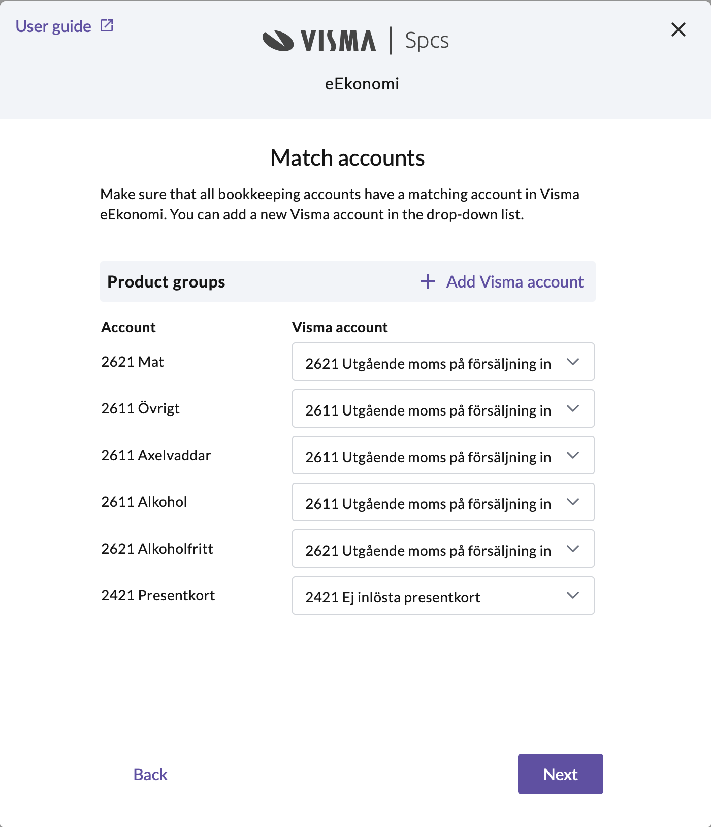 Select which accounting accounts should be used in Visma Spiris for your different product groups. You can also add a new account from the list. Then press NEXT.