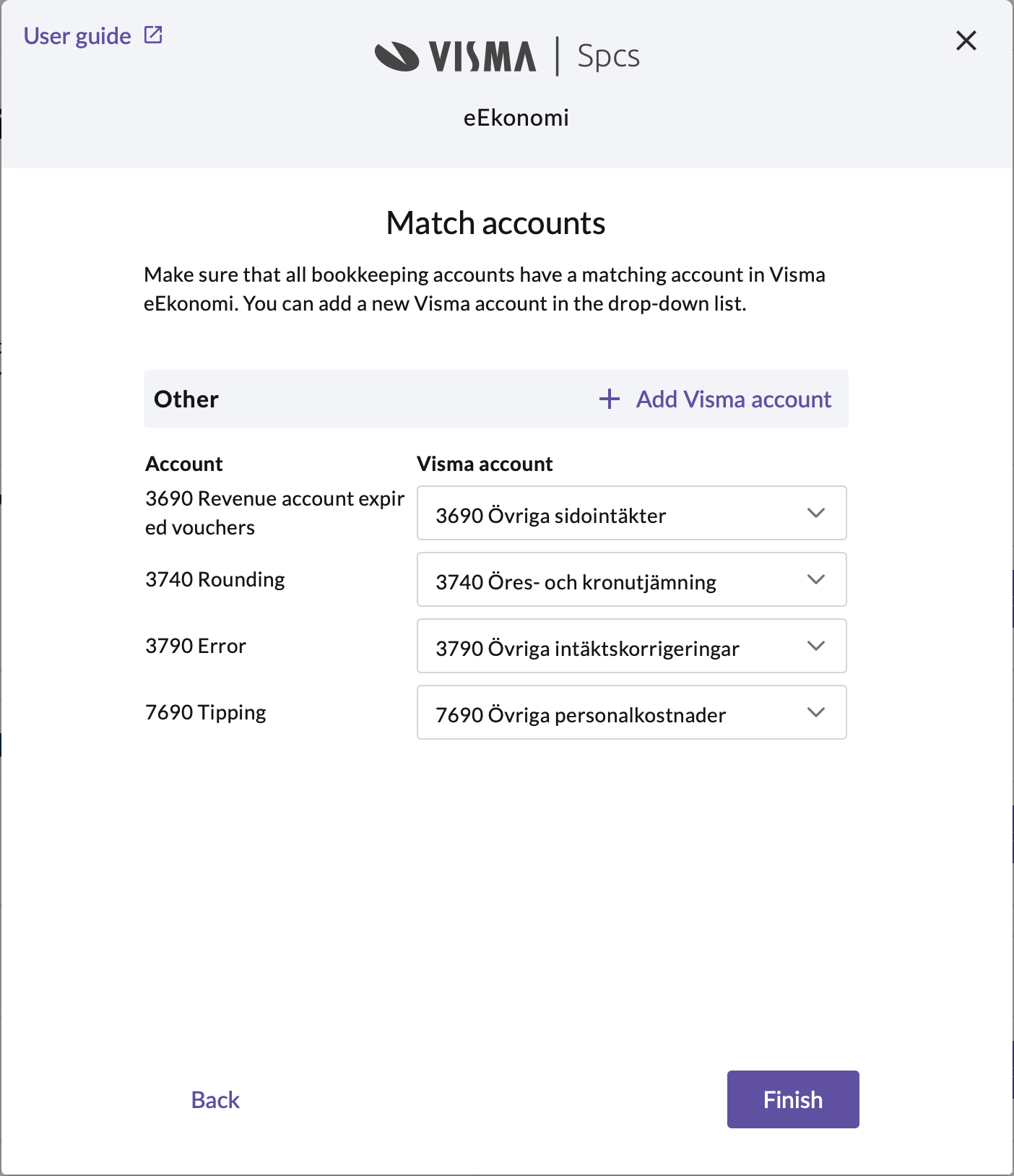 Select which accounting accounts should be used in Visma Spiris for your other events, e.g. accounting for tips. You can also add a new account from the list.