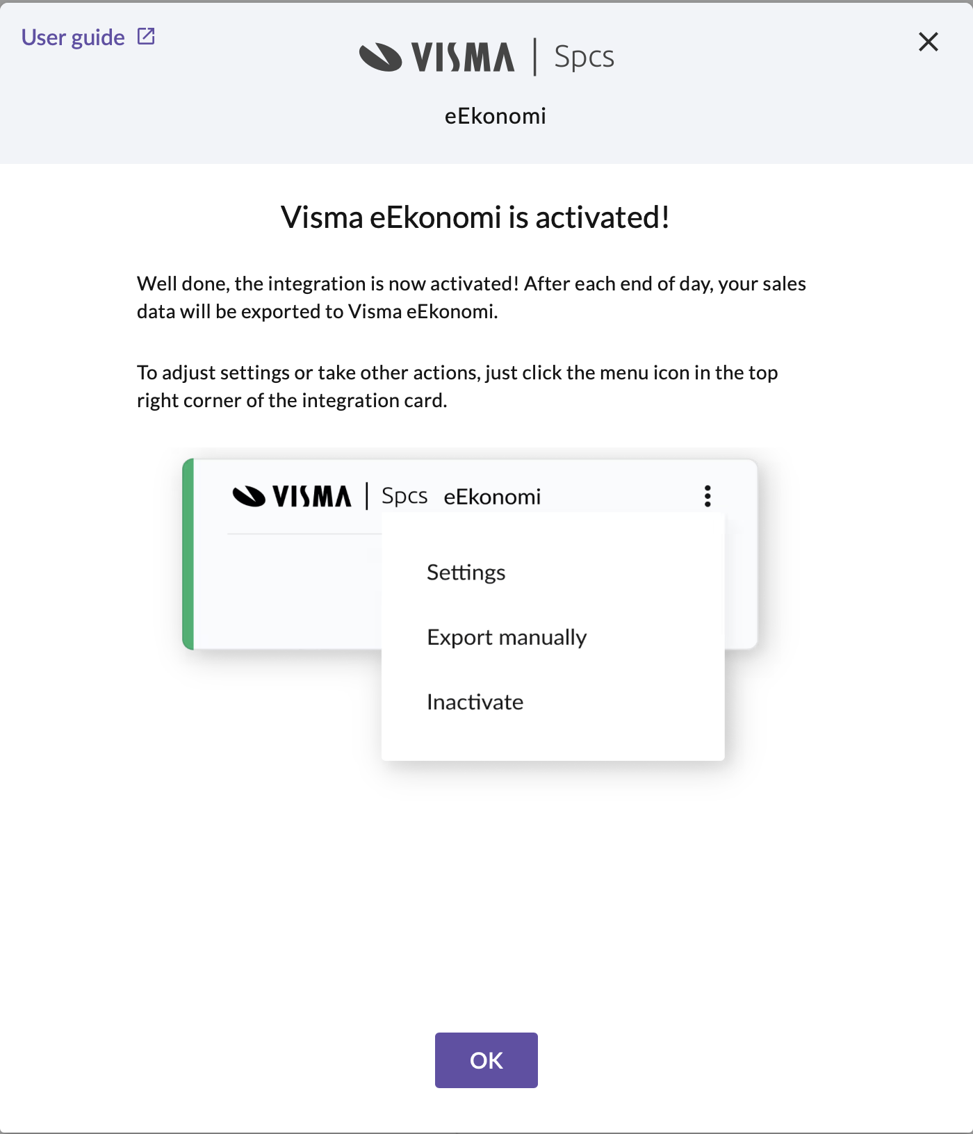 - Now the Visma Spiris integration is activated. Press OK to close the dialog.