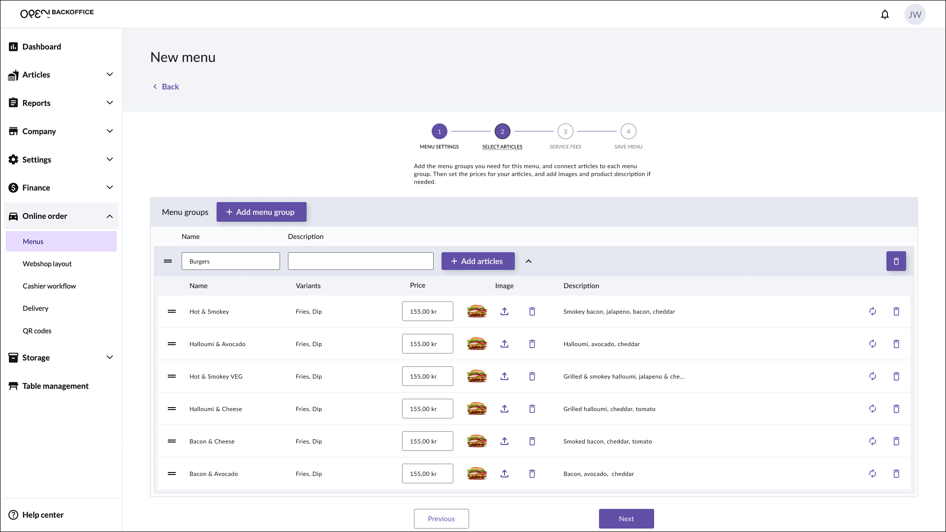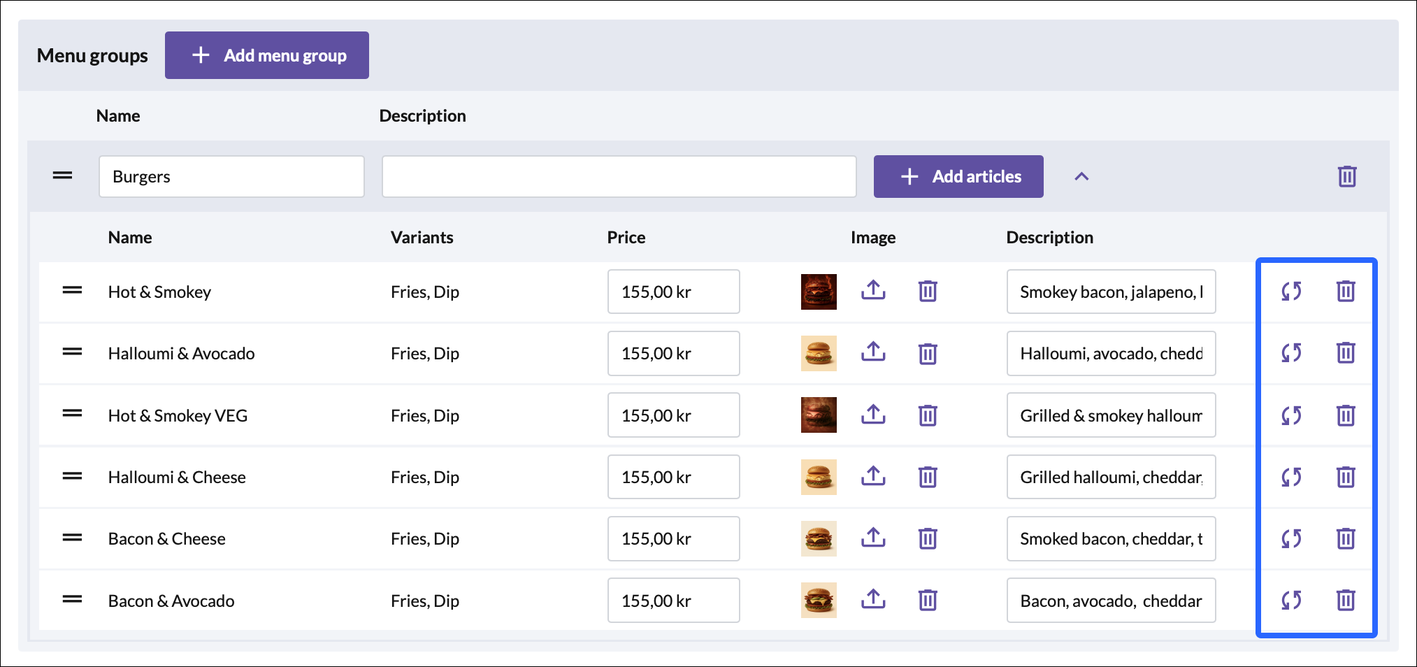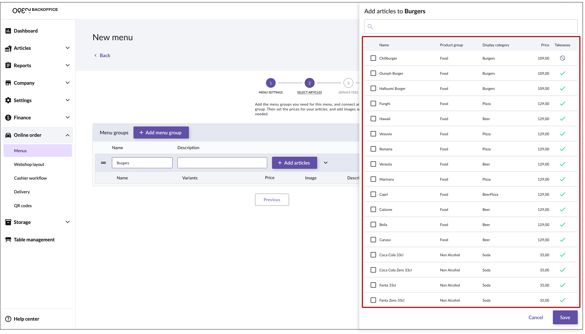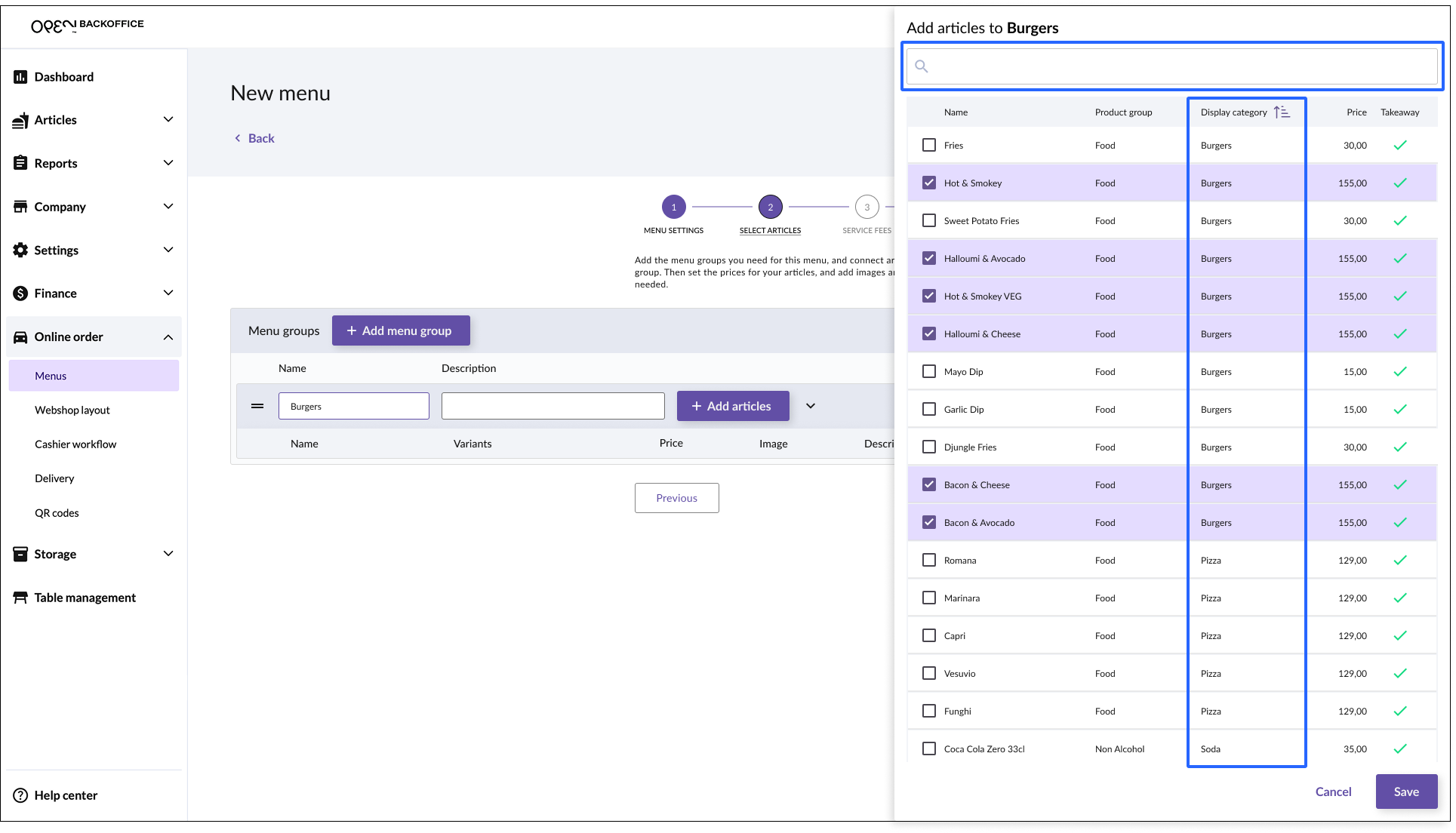 Click Save: Your selected articles will now appear in a table under the menu group "Burgers" (in this example).