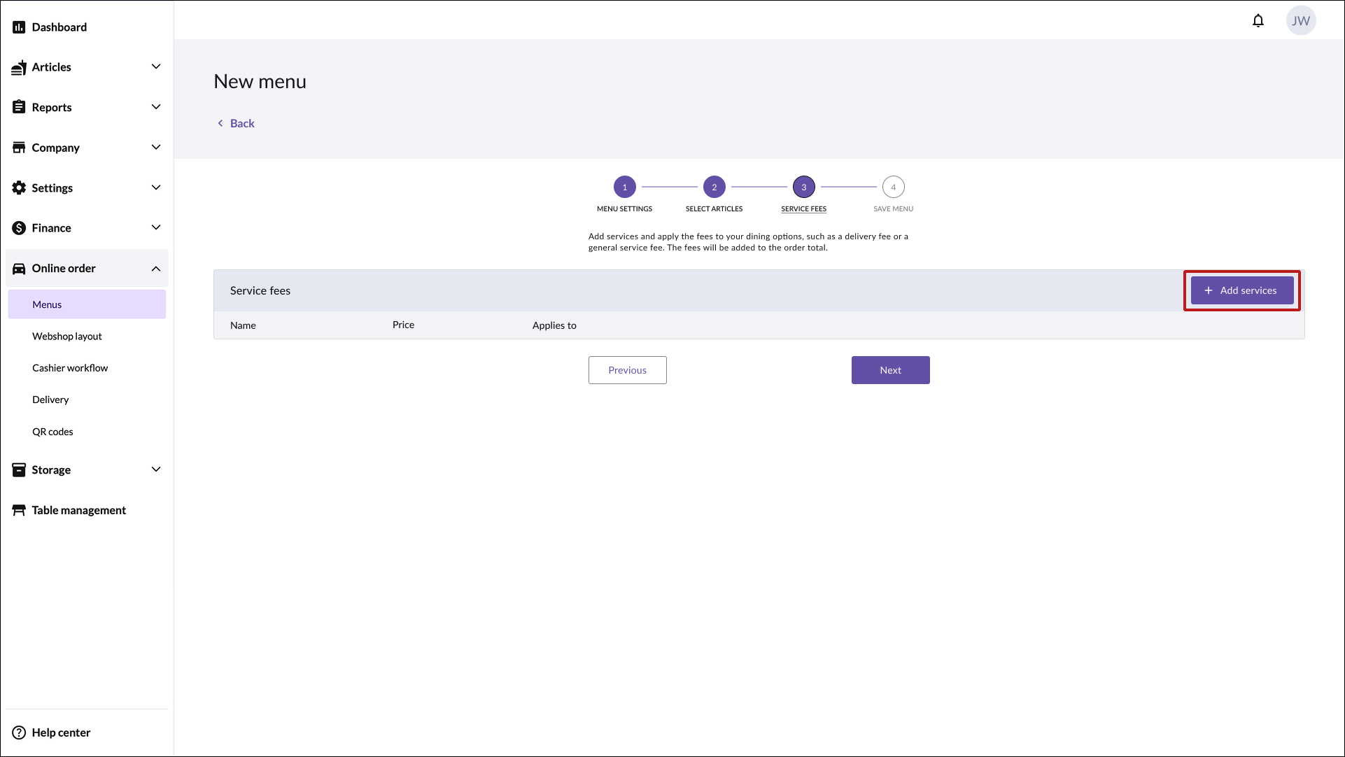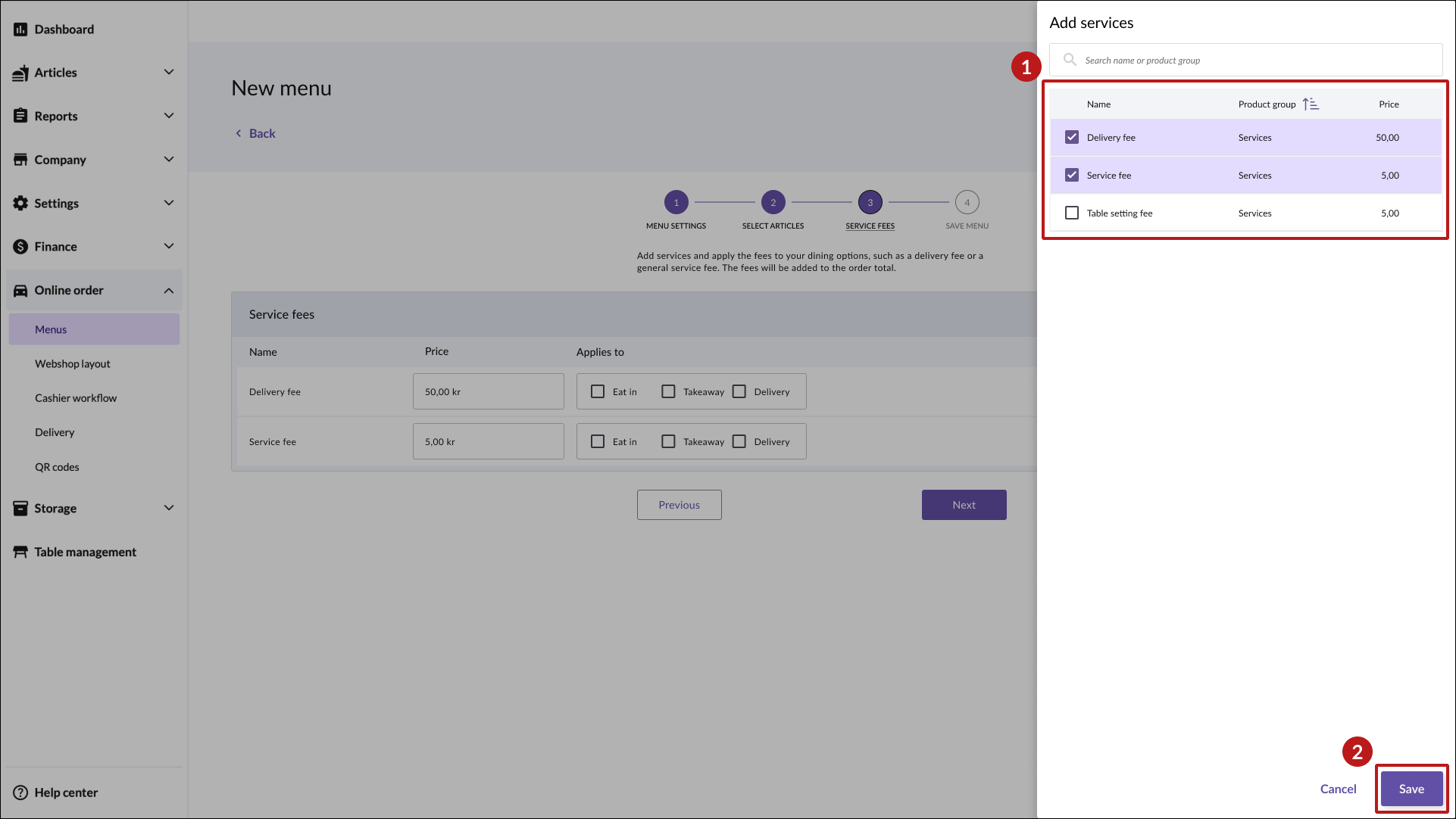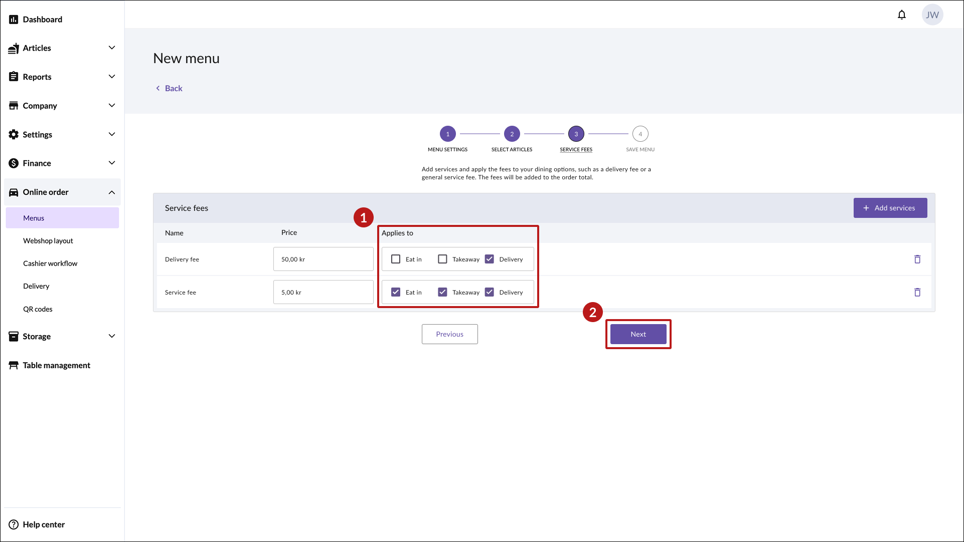 Add fees to your dining options, such as a delivery fee or a general service fee. The fees will be added to the order total.