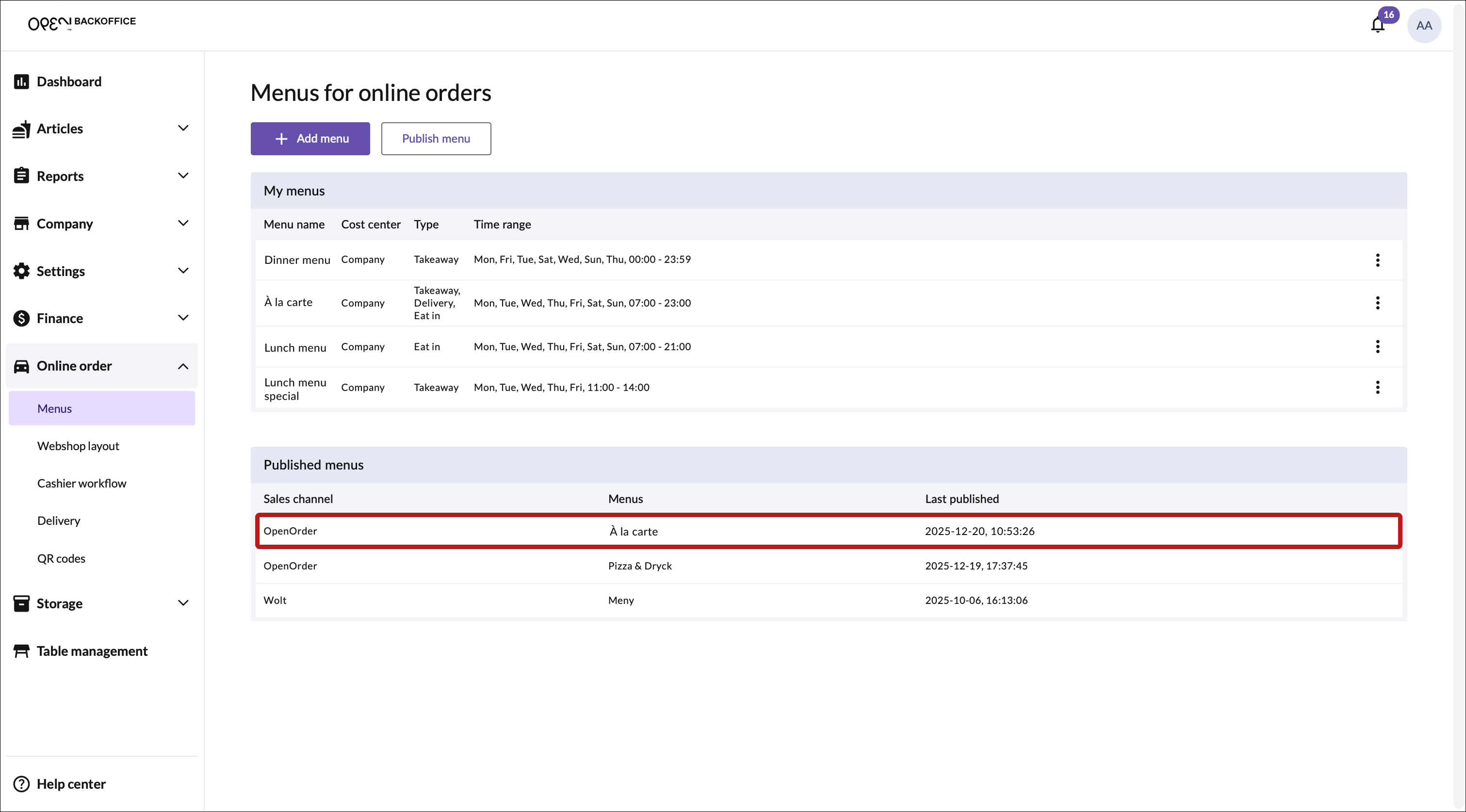 - Click Publish at the bottom of the pop-up. The window will close, and the published menus will appear in a table under Published menus.