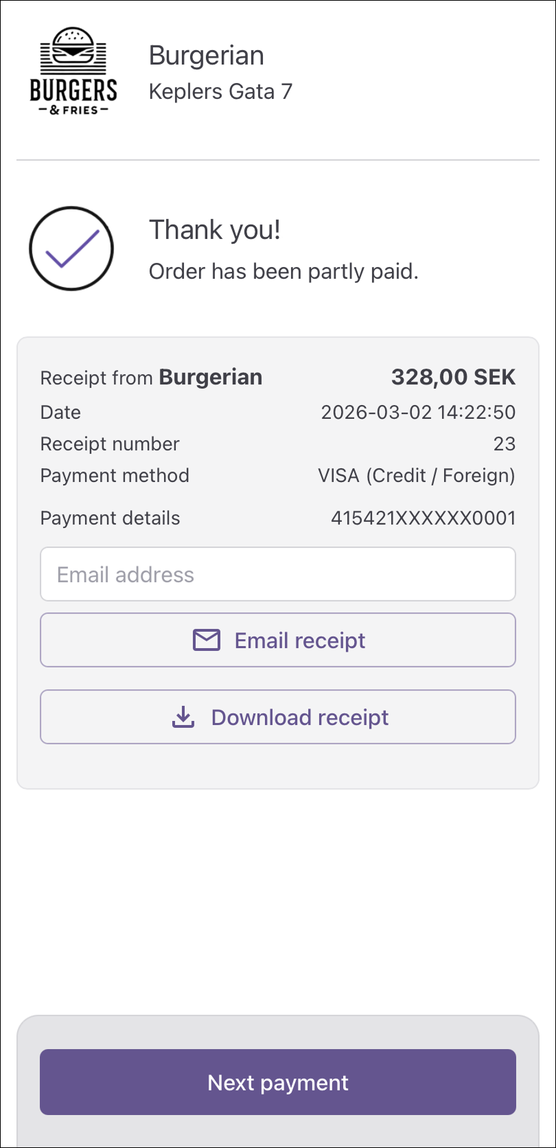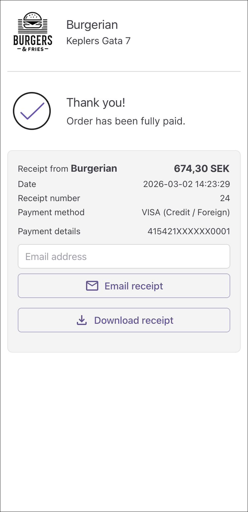 - Swish: Enter your phone number and complete the payment in the Swish app. Payment is confirmed automatically — return to the website to access your receipt.