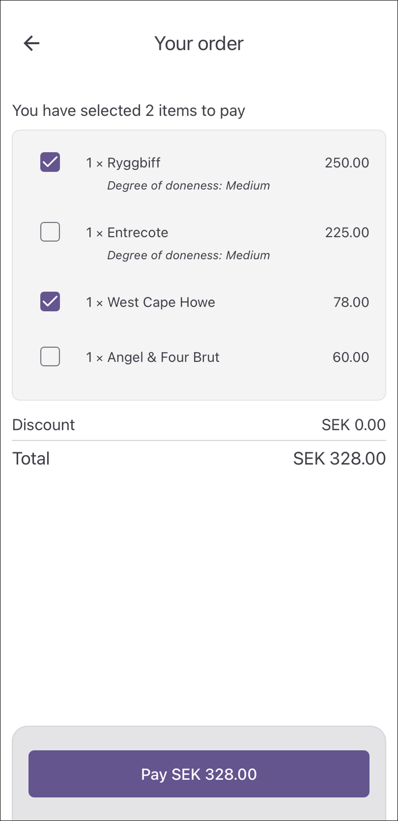 - Items you have selected are marked with purple checkboxes.