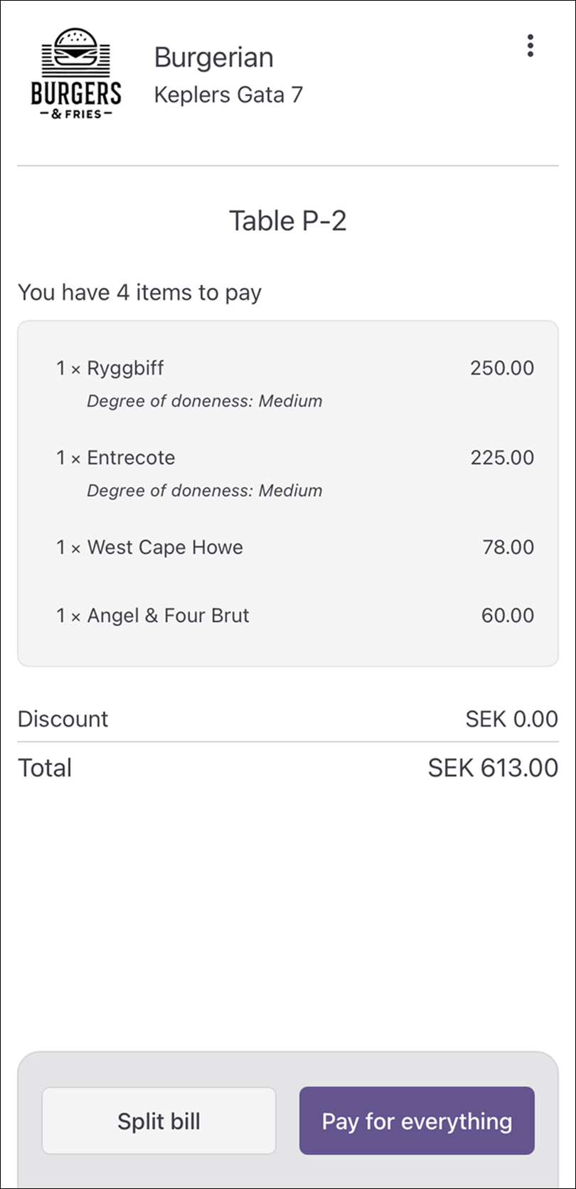 - Choose Pay for everything, or tap Split bill to select specific items.